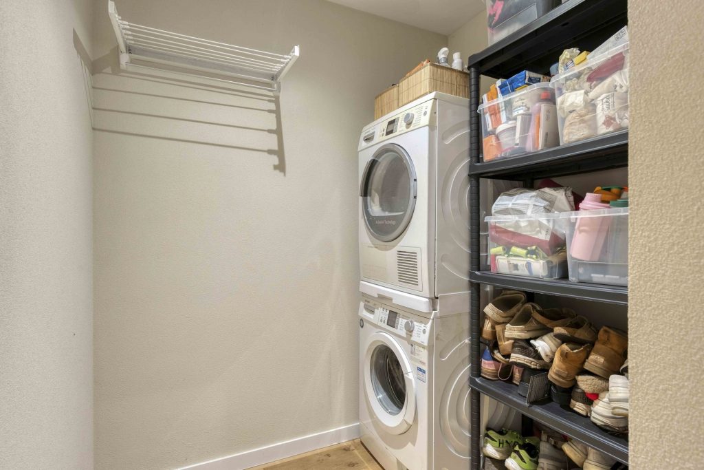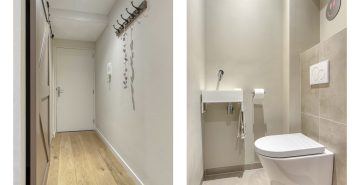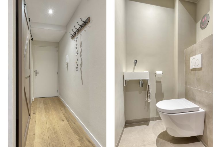 De strak afgewerkte hal vormt een stijlvolle binnenkomer en zet direct de toon. De gehele woning is voorzien van moderne schuurwerk plafonds, strak afgewerkte spachtelputz wanden en een warme eiken parketvloer. Vanuit de hal heb je toegang tot de toiletruimte en een praktische wasruimte.