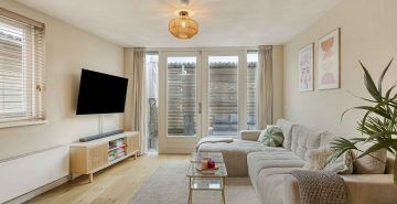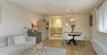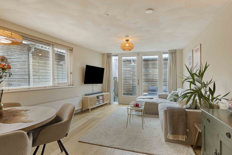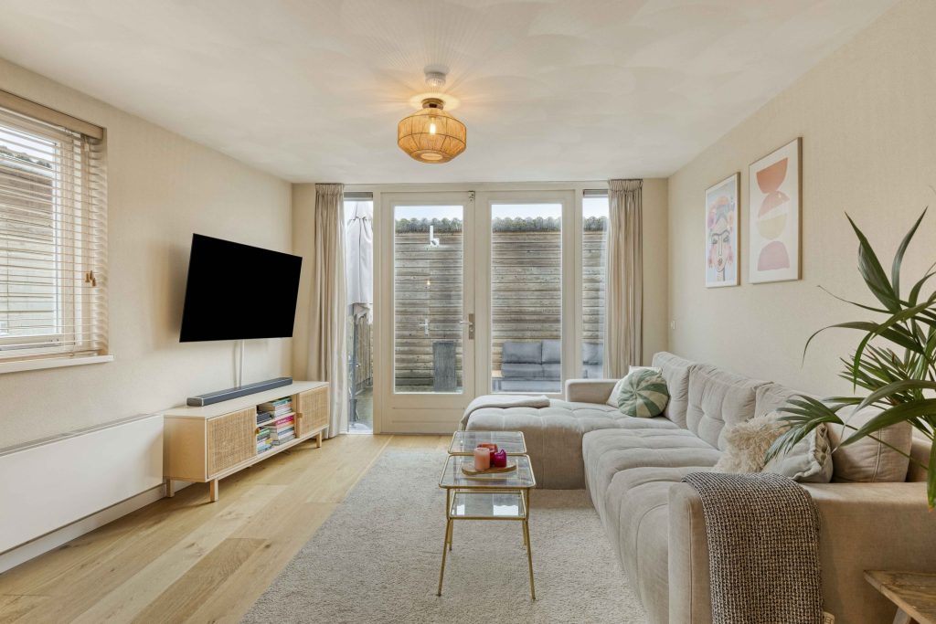 – Lichte woonkamer met raampartijen aan meerdere zijden en openslaande deuren
