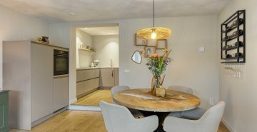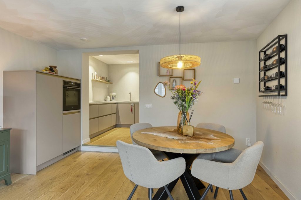 Aan het einde van de hal bevindt zich de open keuken (2024), een echte eyecatcher. Deze is uitgerust met hoogwaardige inbouwapparatuur, waaronder een inductiekookplaat met geïntegreerde afzuiging, combimagnetron, vaatwasser en een koelkast met vriesvak. Met volop kastruimte en een ruim werkblad is dit dé plek voor kookliefhebbers. De open verbinding naar de woonkamer zorgt voor een ruimtelijk geheel. Grote raampartijen aan meerdere zijden en openslaande deuren naar de tuin zorgen voor een prachtige lichtinval en een fijne connectie met buiten.
