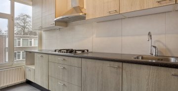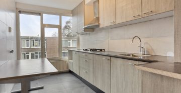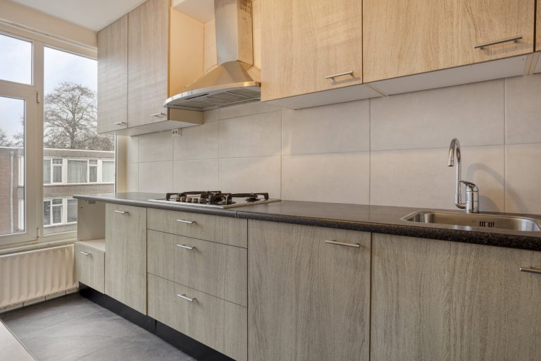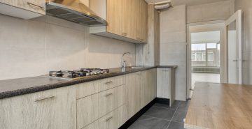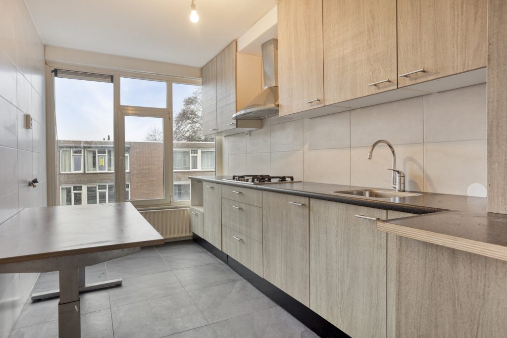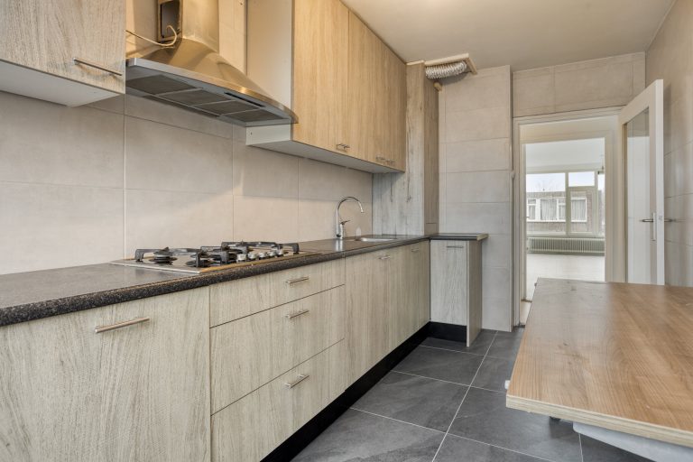 De gesloten keuken is uitgevoerd in een lichte opstelling en voorzien van een 5-pits gaskookplaat, afzuigkap, vaatwasmachine en witgoedaansluitingen. Een praktische en verzorgde ruimte met alles binnen handbereik.