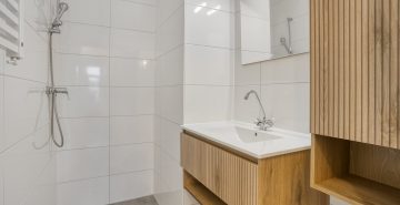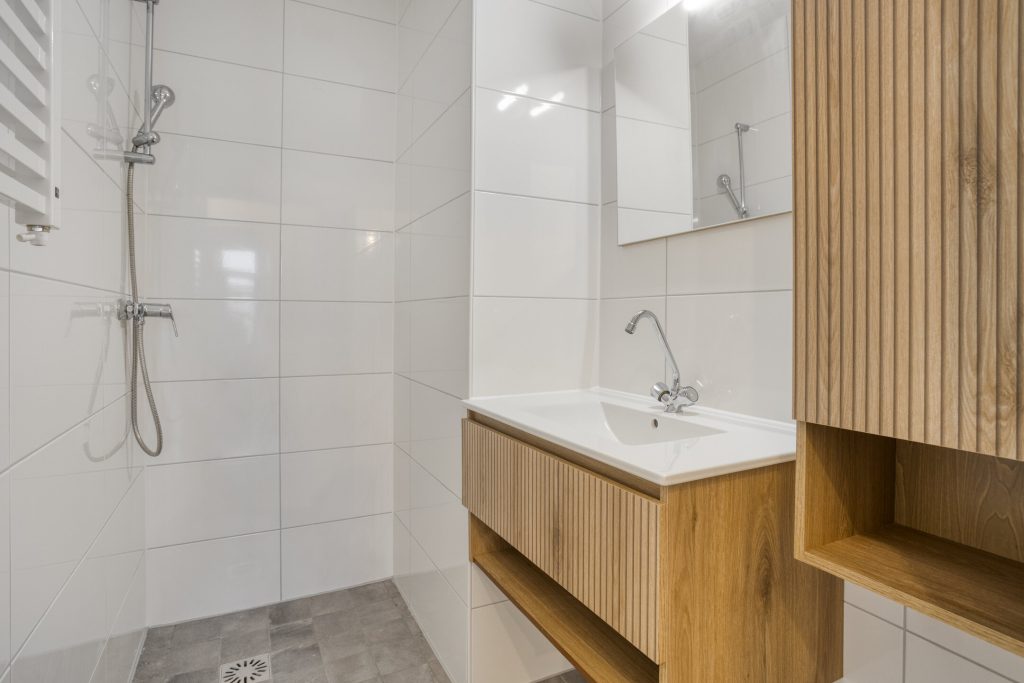 – Badkamer met inloopdouche, wastafel met badmeubel en designradiator