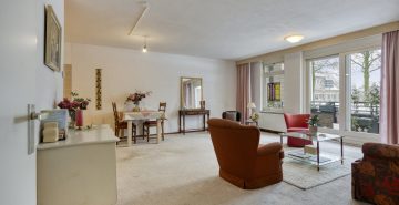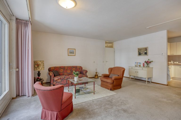 Het appartement is bereikbaar via de centrale hal van het complex. Bij binnenkomst valt direct de praktische indeling op. De hal is voorzien van een videofooninstallatie, een garderoberuimte en een separate toiletruimte. Vanuit hier kom je in de ruime woonkamer met open keuken, een fijne leefruimte met veel lichtinval en een schuifpui naar het balkon/terras. Dankzij de ligging op het zuiden is dit een heerlijke plek om vrijwel de hele dag van de zon te genieten. De keuken is royaal opgezet en uitgevoerd met een licht keukenmeubel en diverse inbouwapparatuur, waardoor koken hier comfortabel en overzichtelijk is.