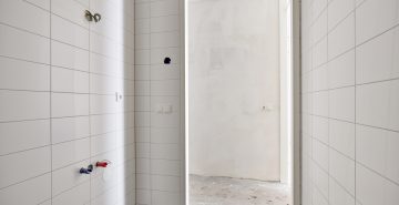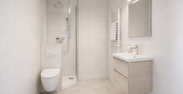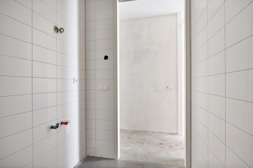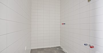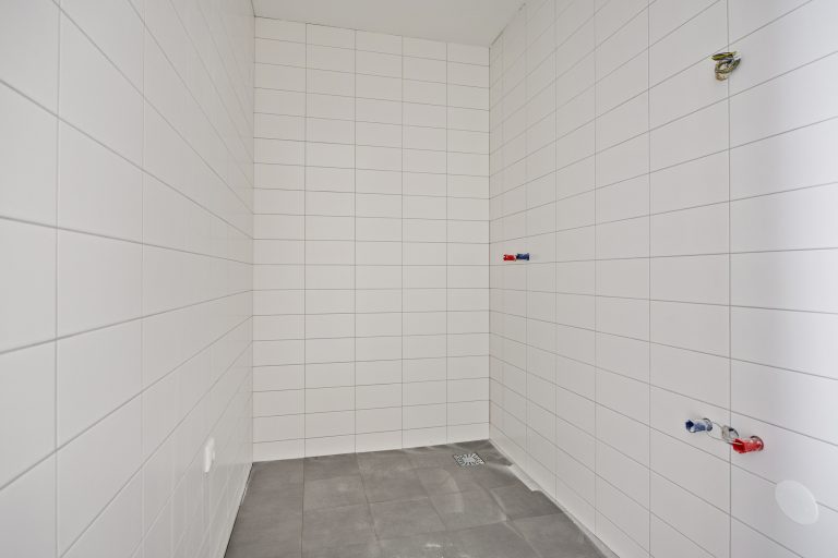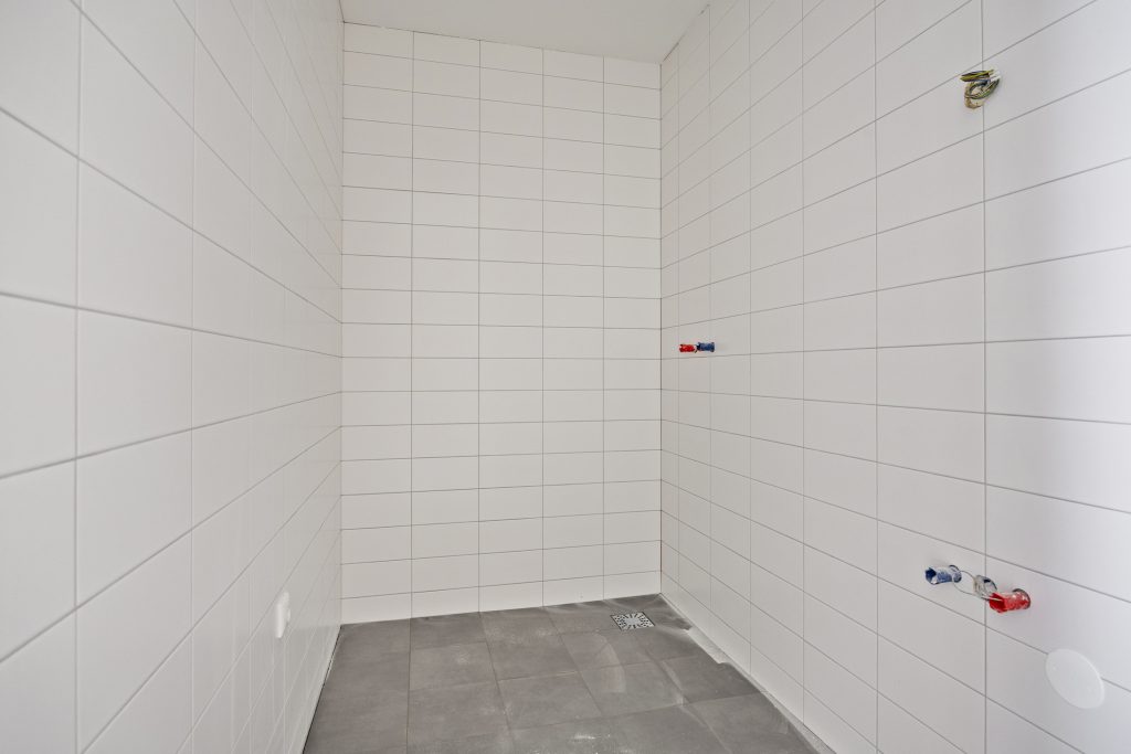 – Badkamer met douche, wastafel en witgoedaansluitingen