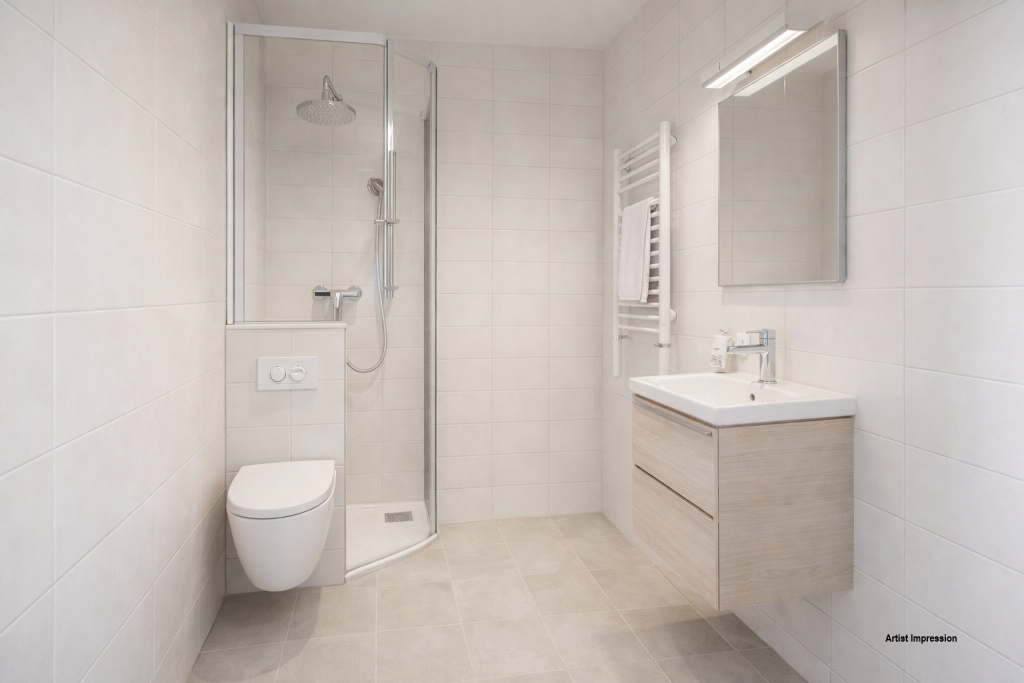 De slaapkamer is rustig gelegen aan de achterzijde van het complex, wat zorgt voor extra privacy en een aangename nachtrust. De badkamer is uitgevoerd met een douche, wastafel en witgoedaansluitingen. Daarnaast beschikt het appartement over een separate toiletruimte met toilet en handfonteintje.