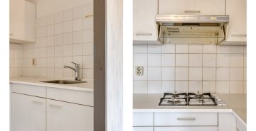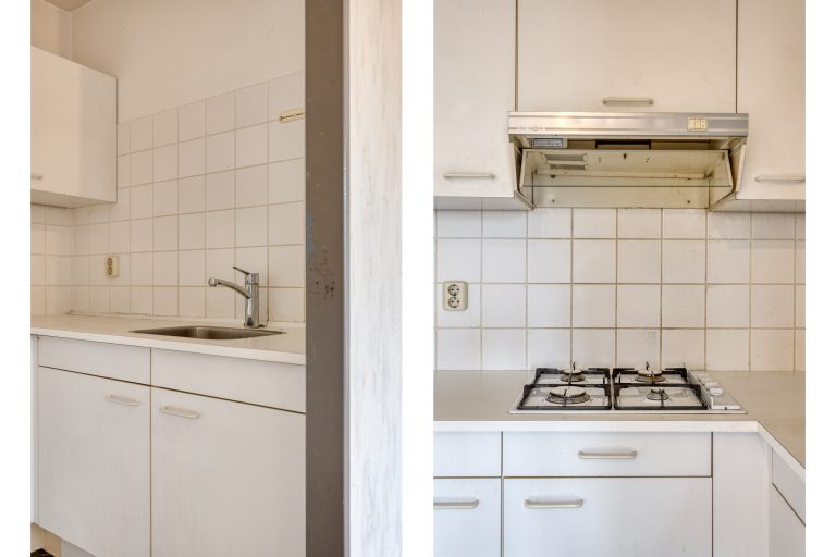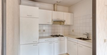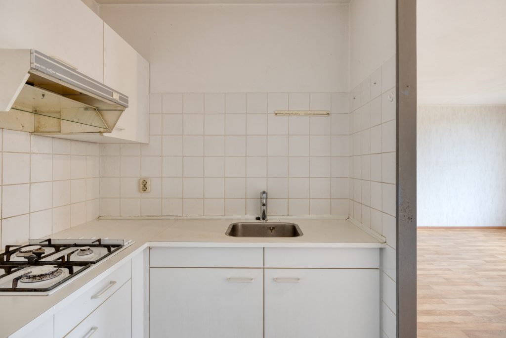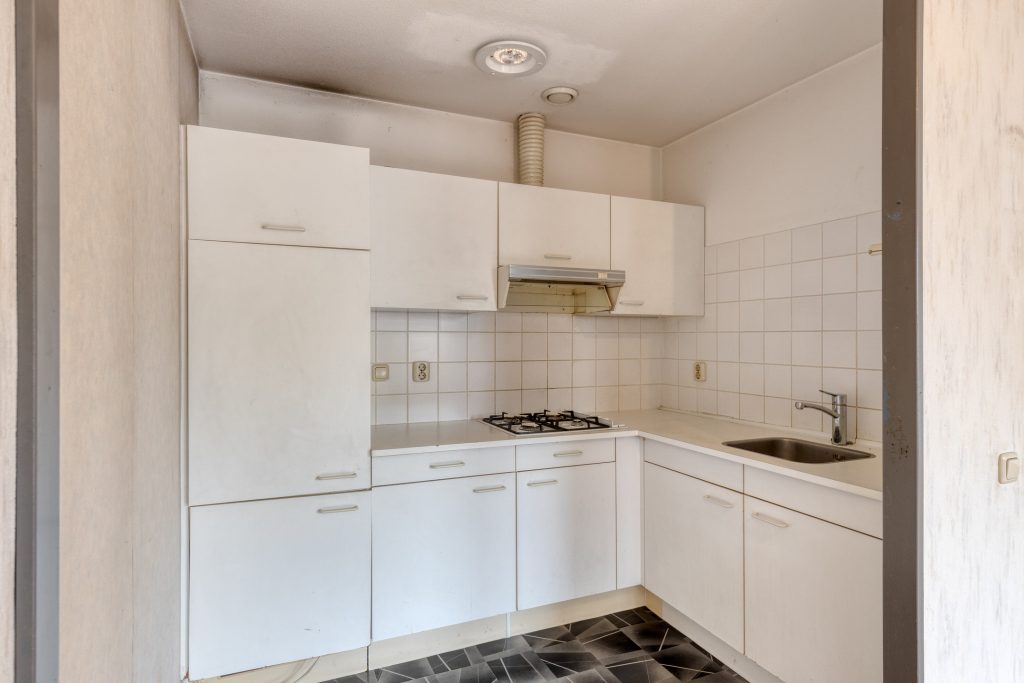 De halfopen keuken sluit naadloos aan op de woonkamer. Het hoekopgestelde keukenmeubel is voorzien van een gaskookplaat, afzuigkap en koelkast en biedt alles wat je nodig hebt voor dagelijks gebruik. Praktisch, overzichtelijk en functioneel ingericht.