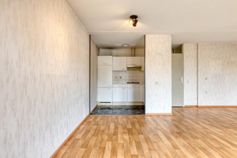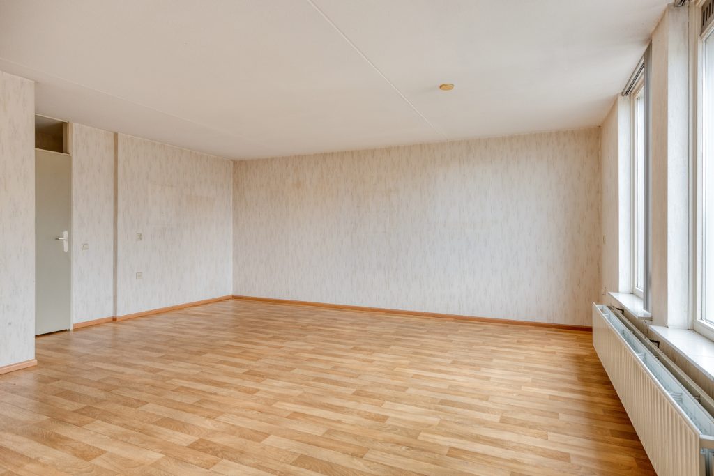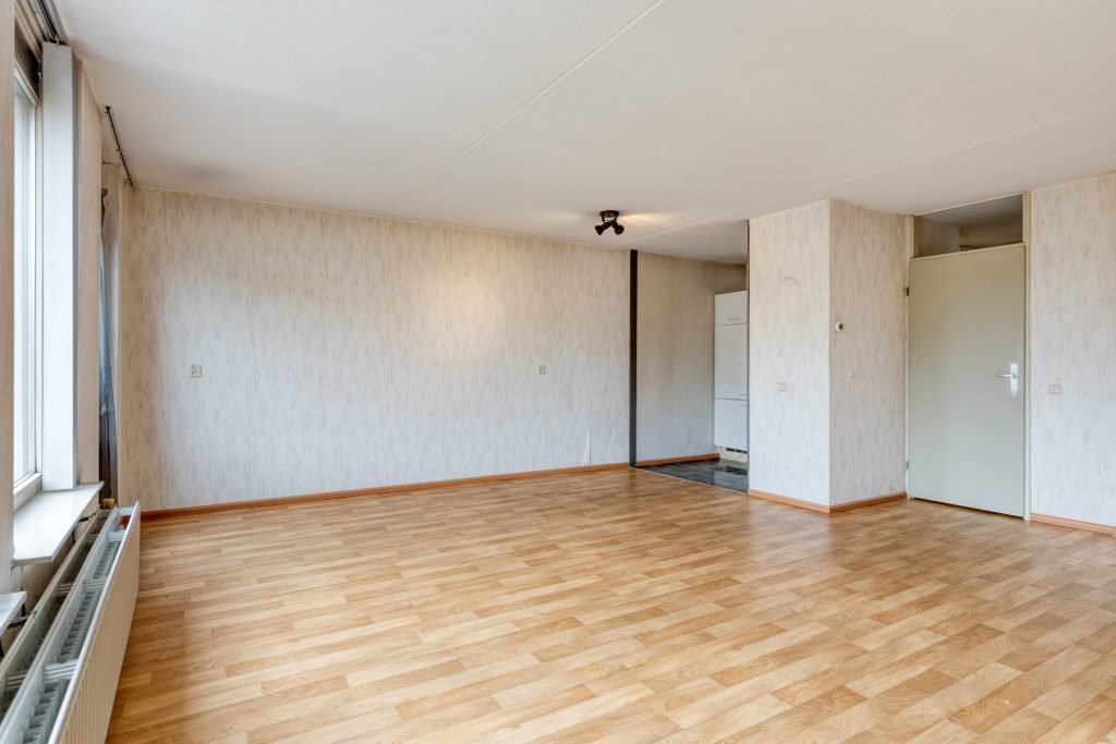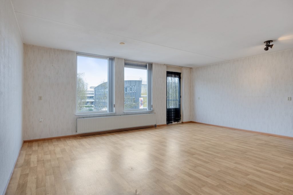 De woonkamer is royaal en prettig ingedeeld, met grote raampartijen die zorgen voor een mooie lichtinval. De warme vinylvloer en het charmante Franse balkon aan de voorzijde dragen bij aan de uitstraling van de ruimte, een fijne plek om tot rust te komen.