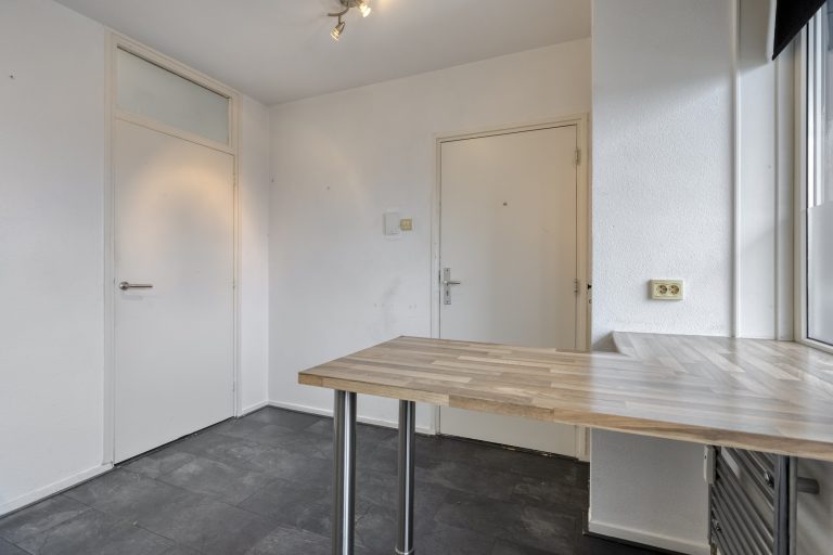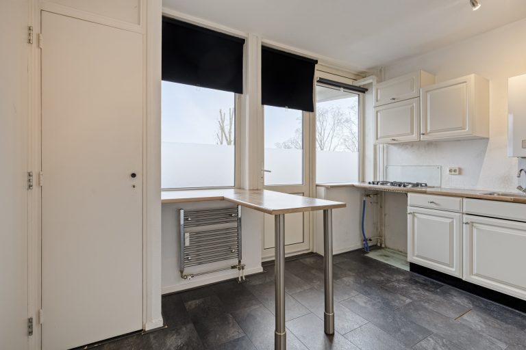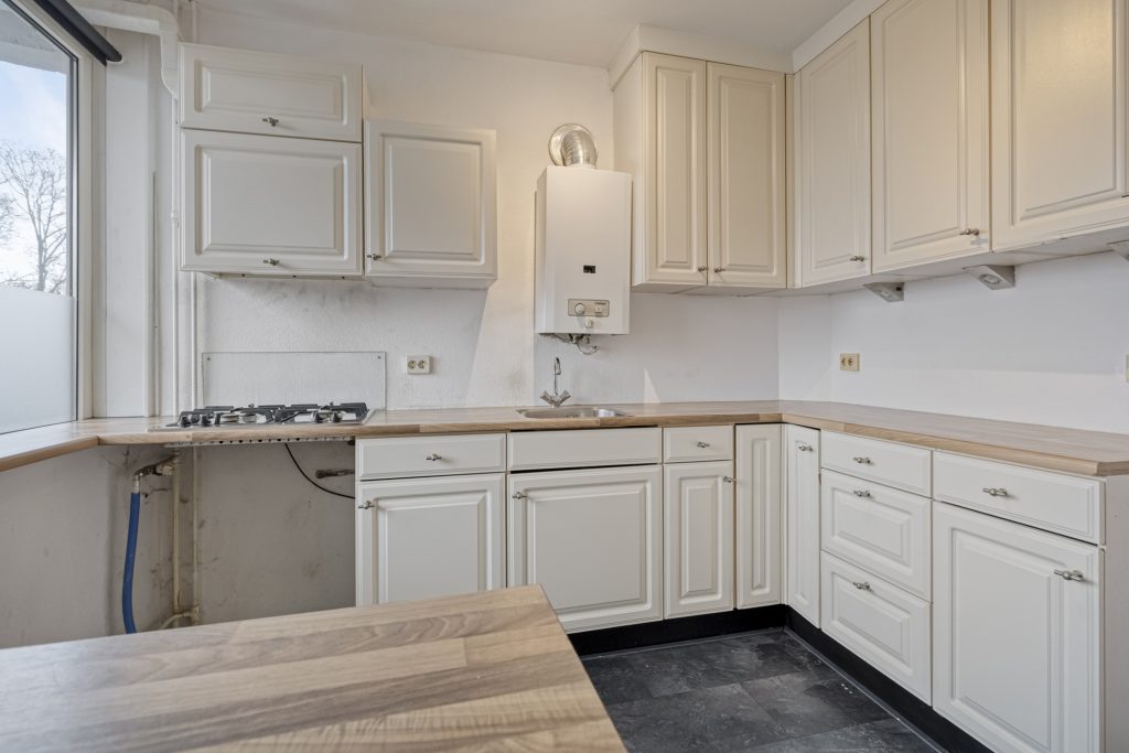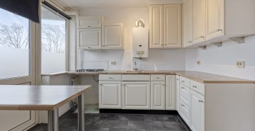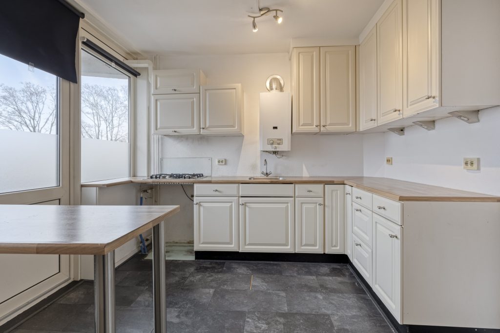 De gesloten keuken is licht en functioneel ingericht met een hoekopgesteld keukenmeubel en voorzien van een 4-pits gaskookplaat, afzuigkap en geiser. Het appartement beschikt over twee slaapkamers, waarvan één is voorzien van witgoedaansluitingen. Een derde slaapkamer is makkelijk te realiseren. De badkamer is uitgerust met een ligbad met douche en een wastafel met meubel, terwijl het toilet zich in een separate ruimte bevindt.