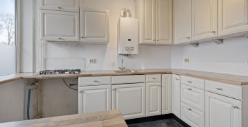 – Gesloten keuken met een licht keukenmeubel in een hoek opgesteld