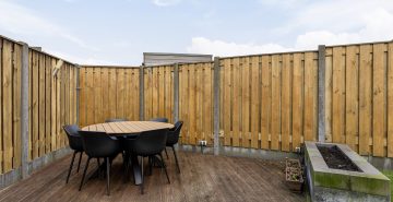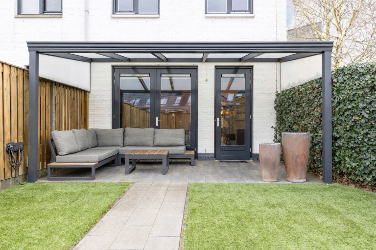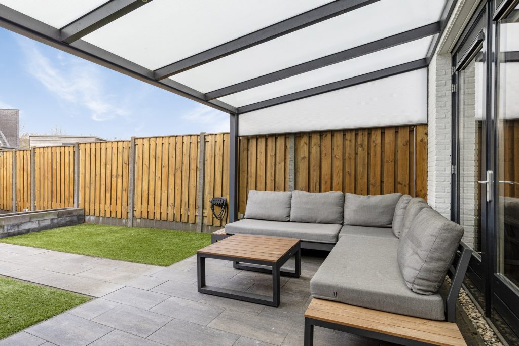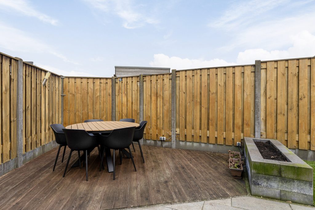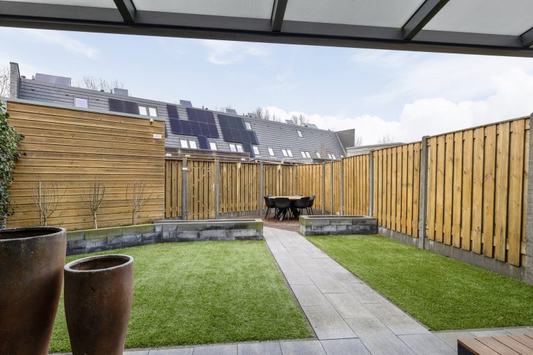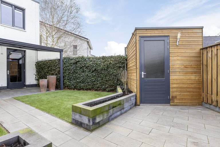 De achtertuin is gelegen op het noorden, volledig omheind en bereikbaar via een achterom. In 2022 zijn het kunstgras en de plantenborders aangelegd, wat zorgt voor een verzorgd en onderhoudsvriendelijk geheel. De tuin beschikt over diverse zitgedeeltes, waarvan één overkapt. De aanwezige verlichting zorgt ook in de avonduren voor een sfeervolle ambiance. Tot slot beschikt de woning over een praktische vrijstaande houten berging met elektra, ideaal voor het stallen van fietsen en het opbergen van tuingereedschap.
