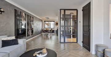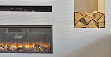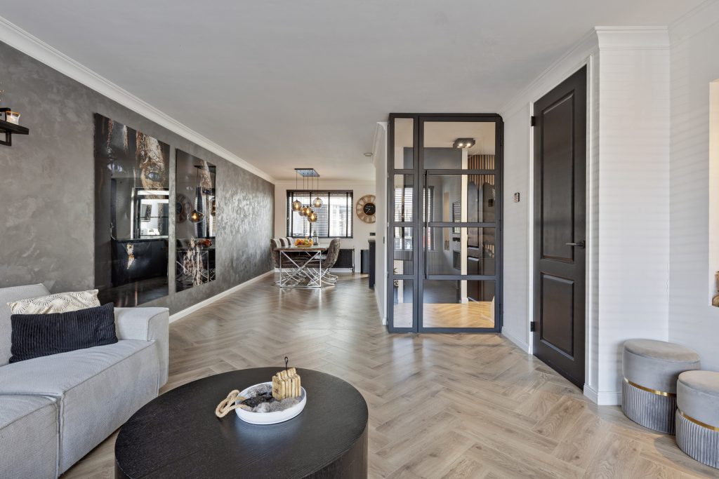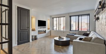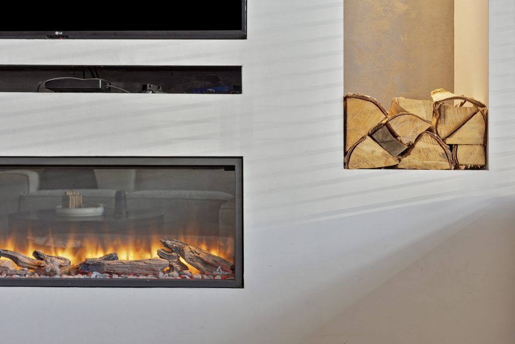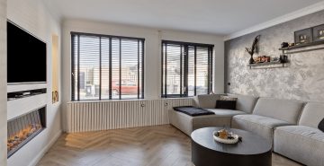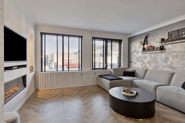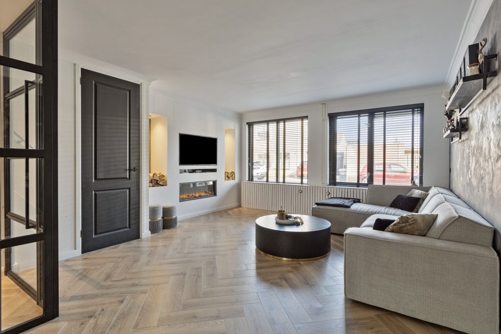 – U-vormige woonkamer met praktische trapkast en sfeervolle, elektrische haard