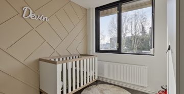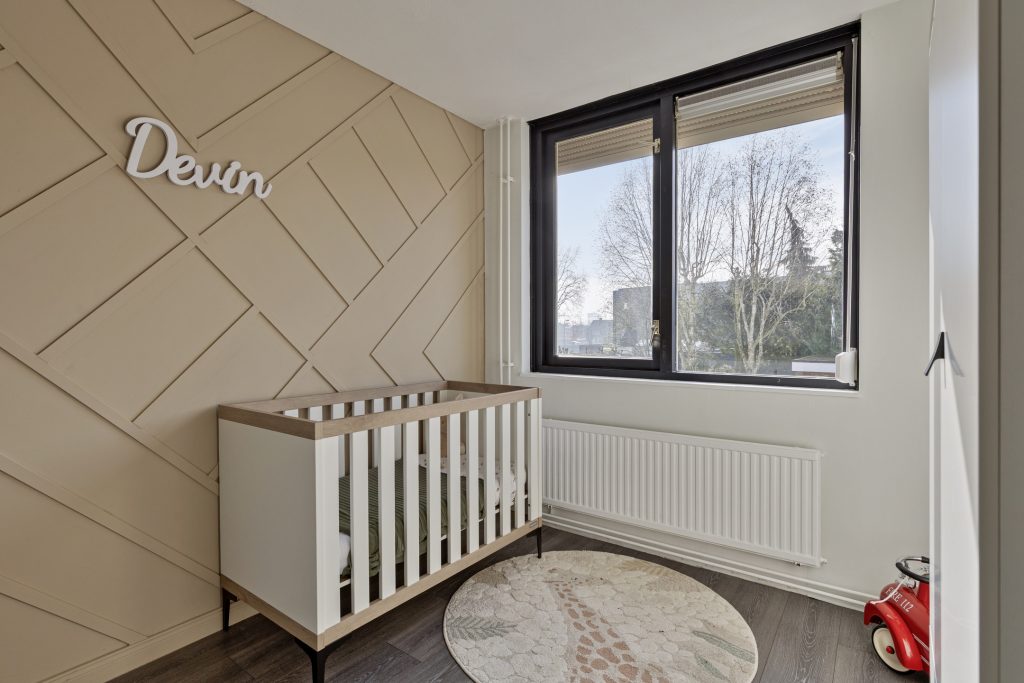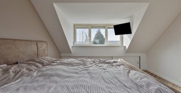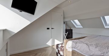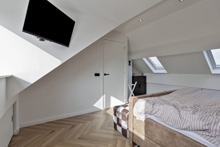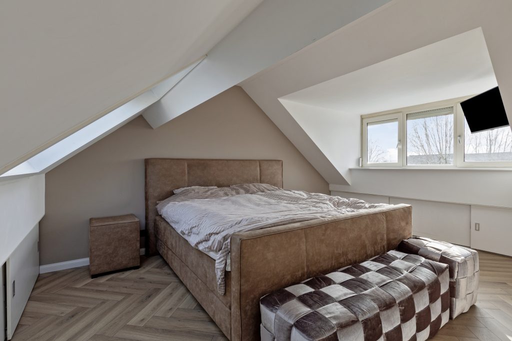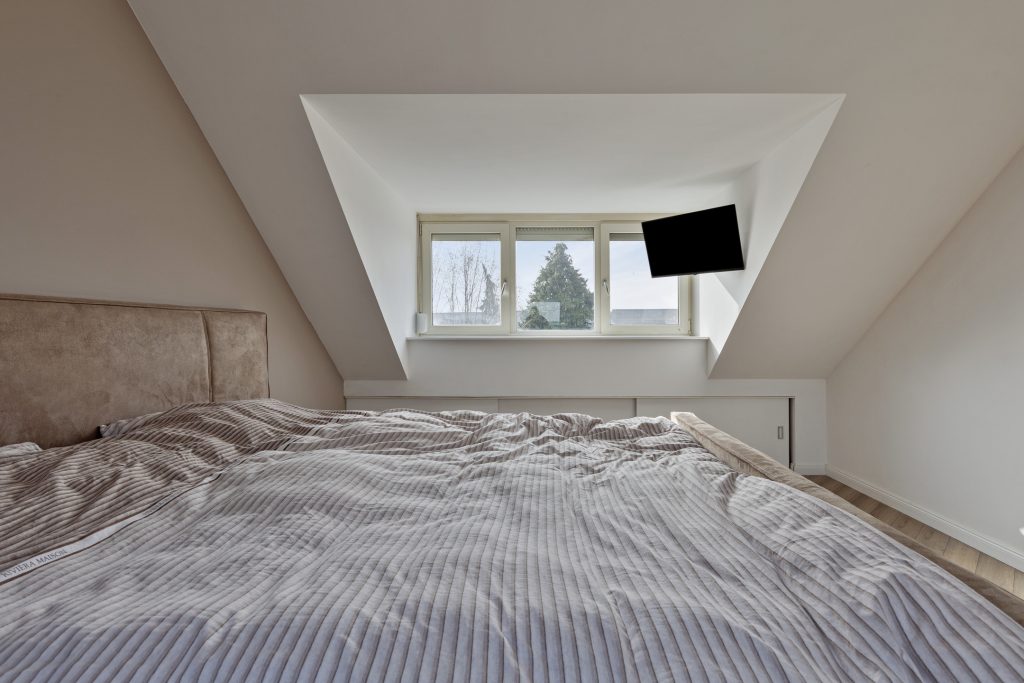 Op de eerste verdieping geeft de overloop toegang tot drie ruime slaapkamers en de badkamer. De badkamer is compleet uitgevoerd met een ligbad met douche, een dubbele wastafel met badmeubel, een zwevend toilet en een designradiator. Aan de zonzijde zijn rolluiken geplaatst, wat bijdraagt aan extra comfort en privacy. De tweede verdieping biedt nog meer ruimte. Hier bevindt zich een voorzolder met opstelling van de cv-ketel en een vierde slaapkamer. Deze kamer is voorzien van airconditioning, waardoor het hier ook op warme dagen aangenaam verblijven is.