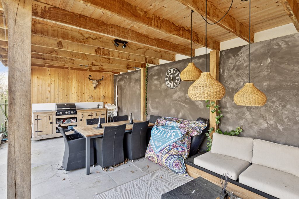 Buiten beschikt de woning over een royale achtertuin op het zonnige zuiden. De tuin is onderhoudsarm aangelegd, volledig afgescheiden en voorzien van tuinverlichting. De gezellige overkapping maakt het mogelijk om hier al vroeg in het voorjaar en tot laat in het najaar heerlijk buiten te zitten.