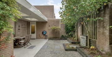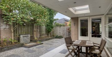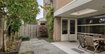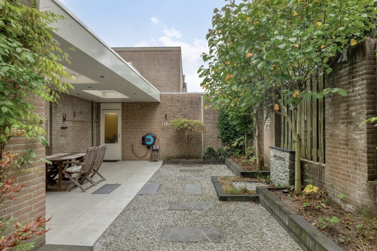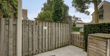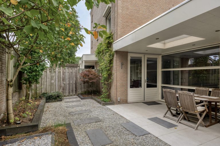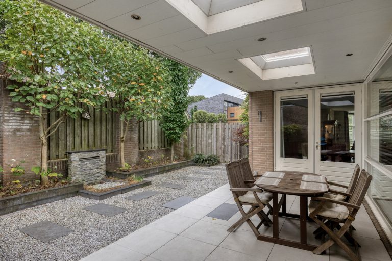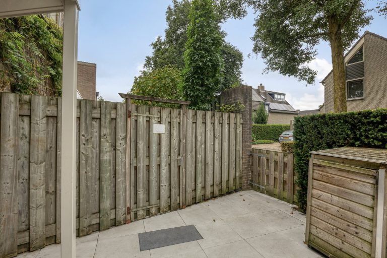 Buiten vind je een onderhoudsvriendelijke tuin met een groot terras en groene borders. Dankzij de ligging op het zuiden en de gezellige overkapping kun je hier extra lang van het buitenleven genieten. De tuin is ook via een achterom bereikbaar en is geheel afgescheiden.