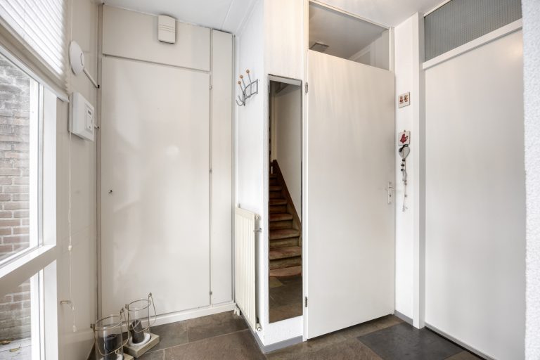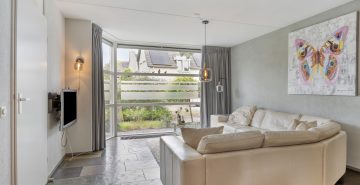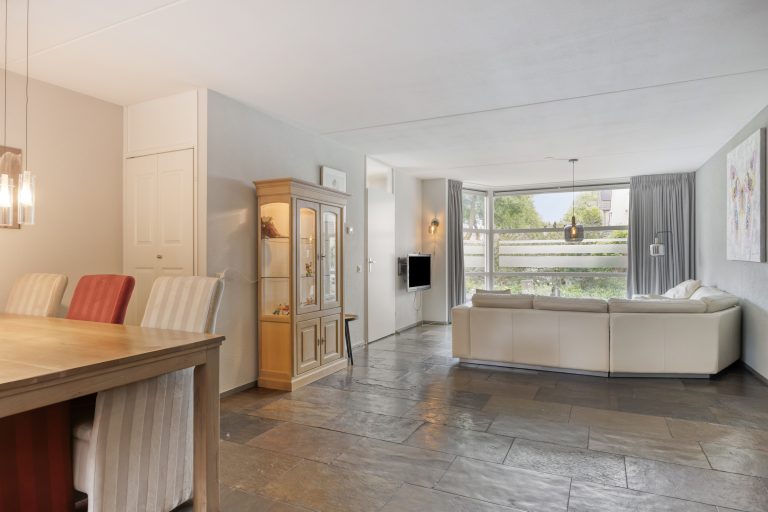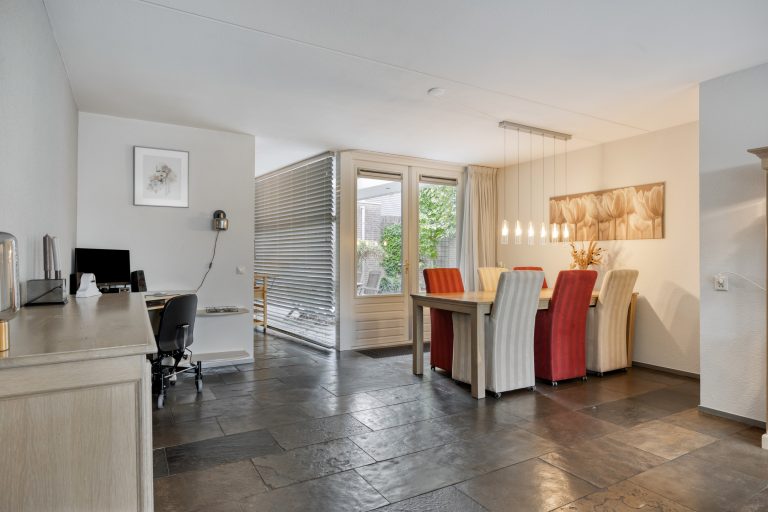 Bij binnenkomst word je verwelkomd in een ruime hal met een garderobe, het toilet en de meterkast. Zodra je doorloopt naar de woonkamer, valt direct de fijne indeling op. De woonkamer is royaal opgezet met een sfeervolle erker aan de voorzijde en openslaande tuindeuren aan de achterzijde. Hierdoor stroomt het daglicht rijkelijk naar binnen en voelt de ruimte open, luchtig en uitnodigend. De woonkamer is afgewerkt met een chique antracietgrijze tegelvloer en voorzien van vloerverwarming.