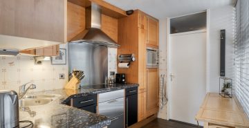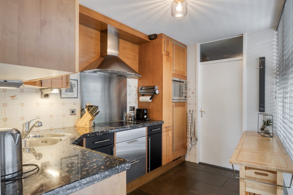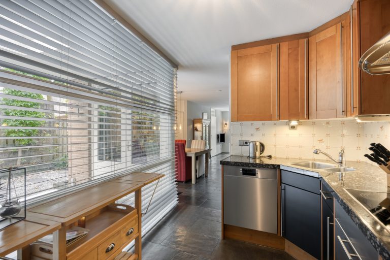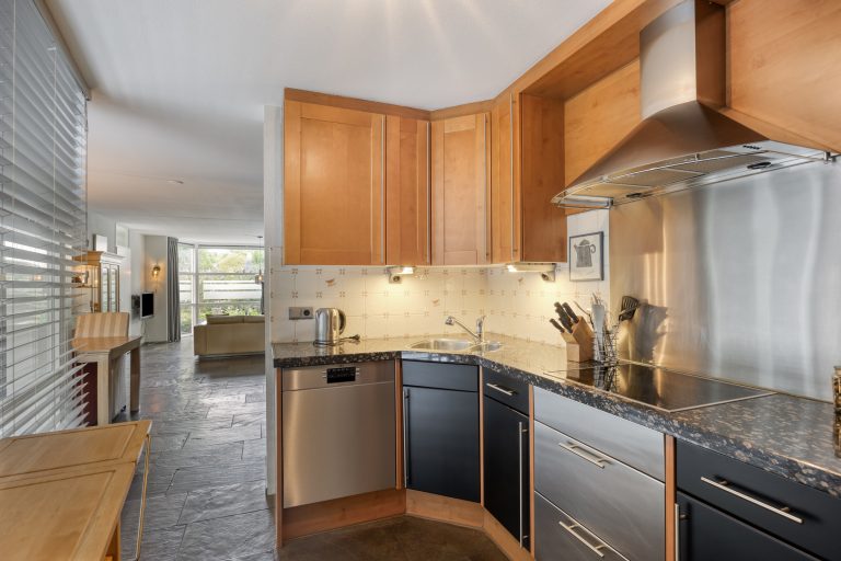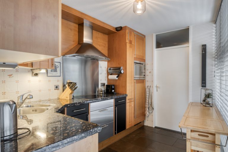 De keuken sluit perfect aan bij de rest van de woning. Met zijn speelse accenten is dit een plek waar je graag staat te koken. Uiteraard is de keuken compleet uitgerust met een inbouw inductiekookplaat, een vaatwasser, koelkast, , afzuigkap en een combi-oven. Het grote raam zorgt voor veel natuurlijk licht en een heerlijk uitzicht terwijl je je kopje koffie of thee drinkt.