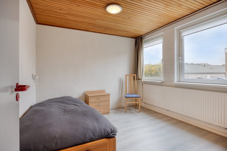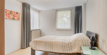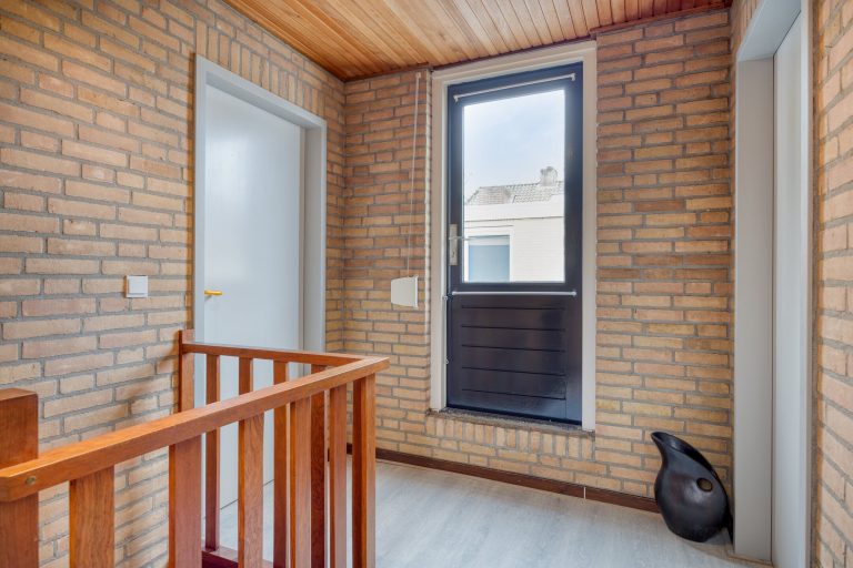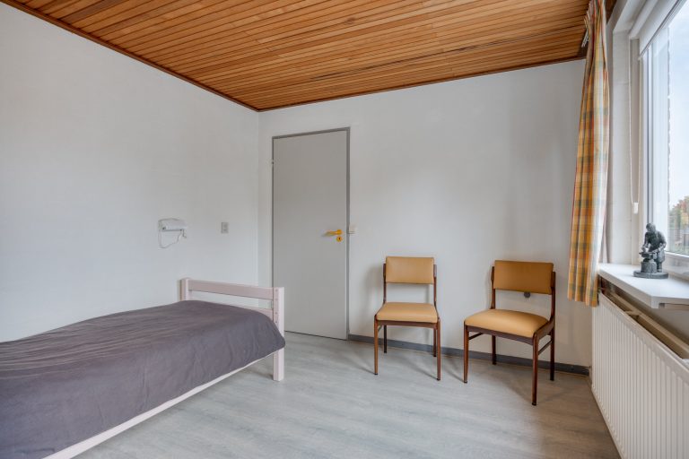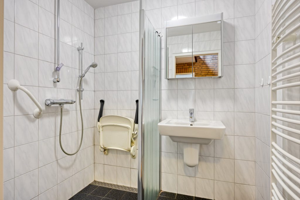 Aangrenzend bevindt zich een praktische bijkeuken met witgoedaansluitingen en handige inbouwkasten, een fijne plek om alles georganiseerd en uit het zicht te houden. Wat deze woning echt bijzonder maakt, is de royale slaapkamer op de begane grond. In combinatie met de nette, ruime badkamer met inloopdouche en wastafel maakt dit de woning volledig levensloopbestendig, zonder in te leveren op stijl of ruimte.