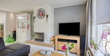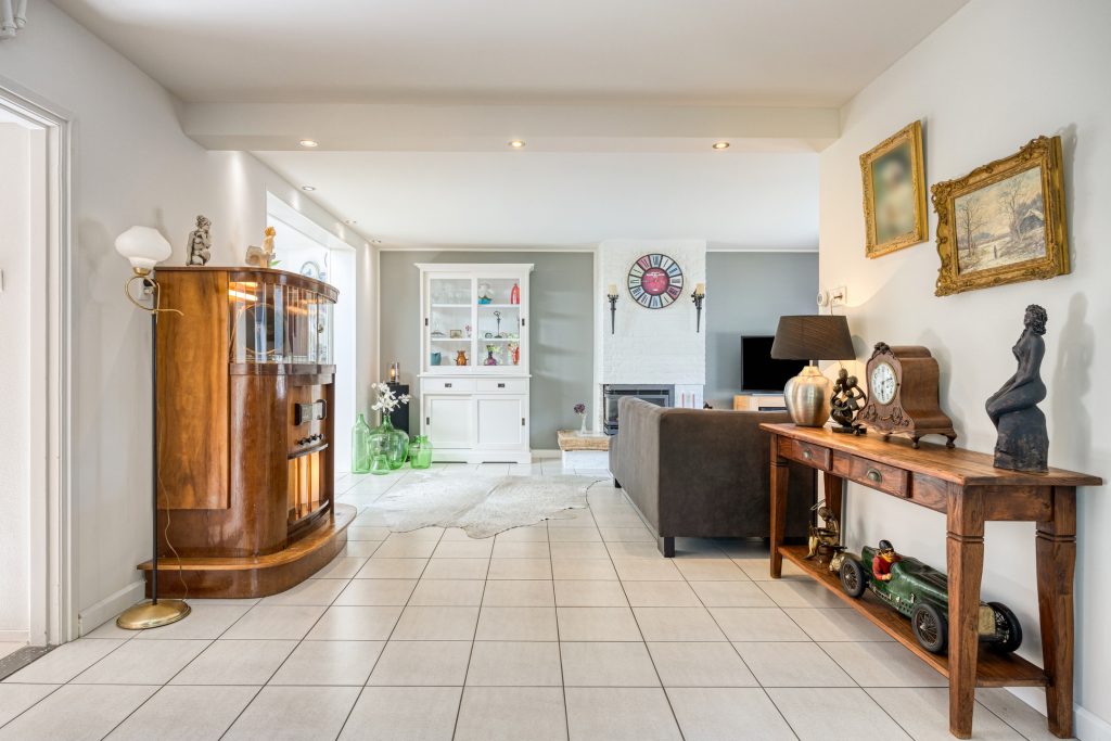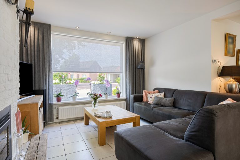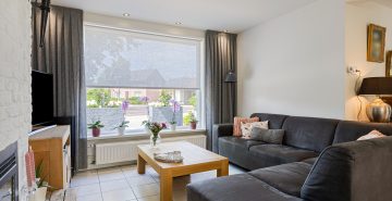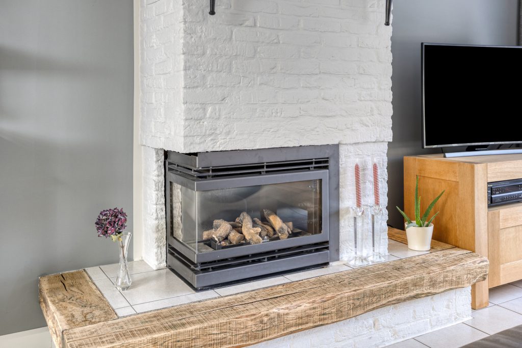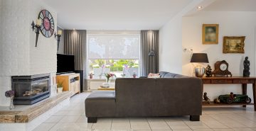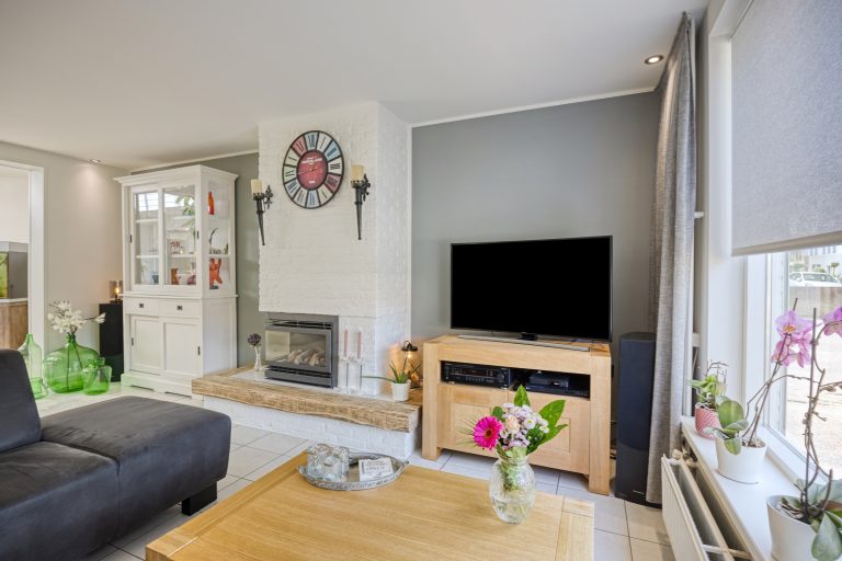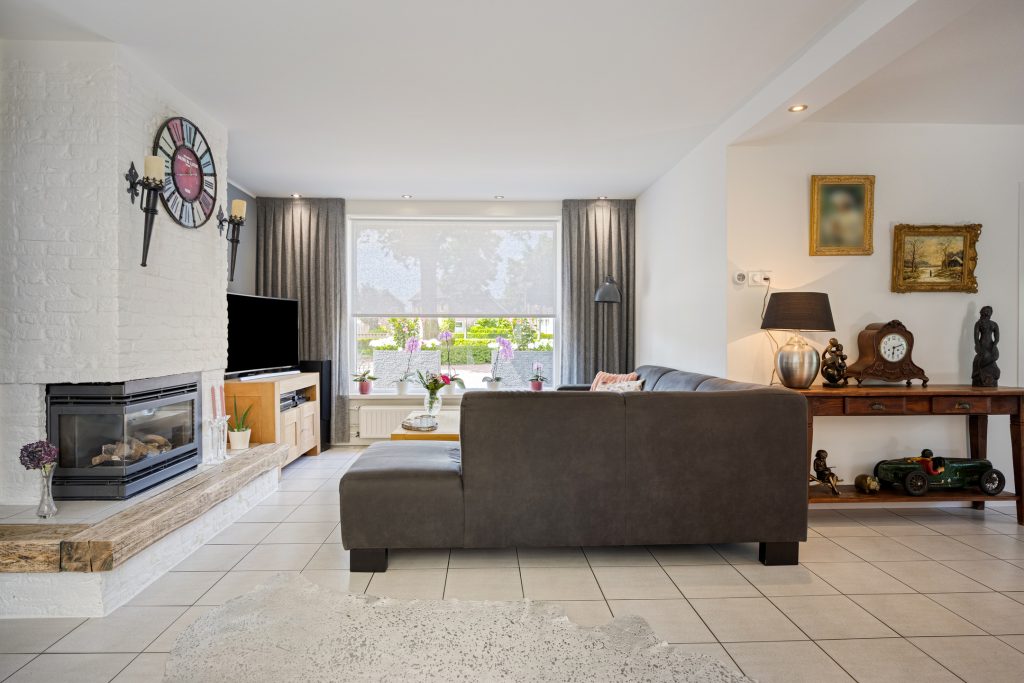 – Lichte woonkamer door de grote raampartijen en sfeervolle gashaard