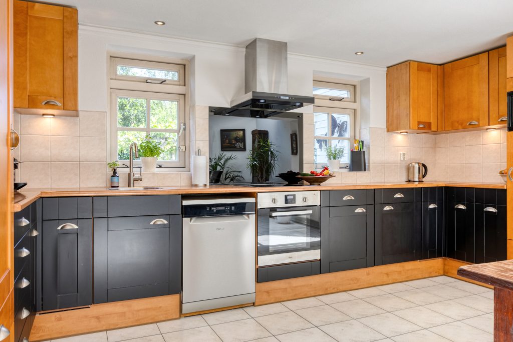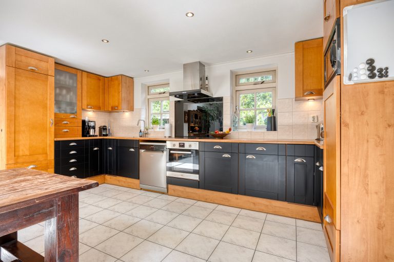 Bij binnenkomst wordt u verwelkomd in de hal, waar zich de meterkast en de trapopgang naar de eerste verdieping bevinden. Vanuit hier bereikt u de royale woonkamer, die dankzij de grote raampartijen een lichte en open sfeer heeft. De open keuken is voorzien van diverse inbouwapparatuur en biedt alle ruimte voor zowel koken als gezellig tafelen. Vanuit de keuken bevindt zich een doorgang naar de hal aan de achterkant van het woonhuis inclusief werkkamer/kantoor, twee bergingen en de bijkeuken.