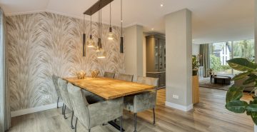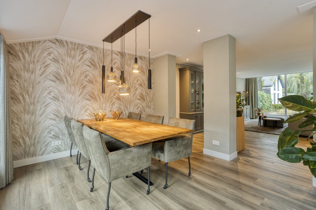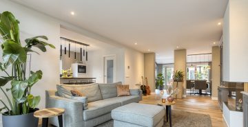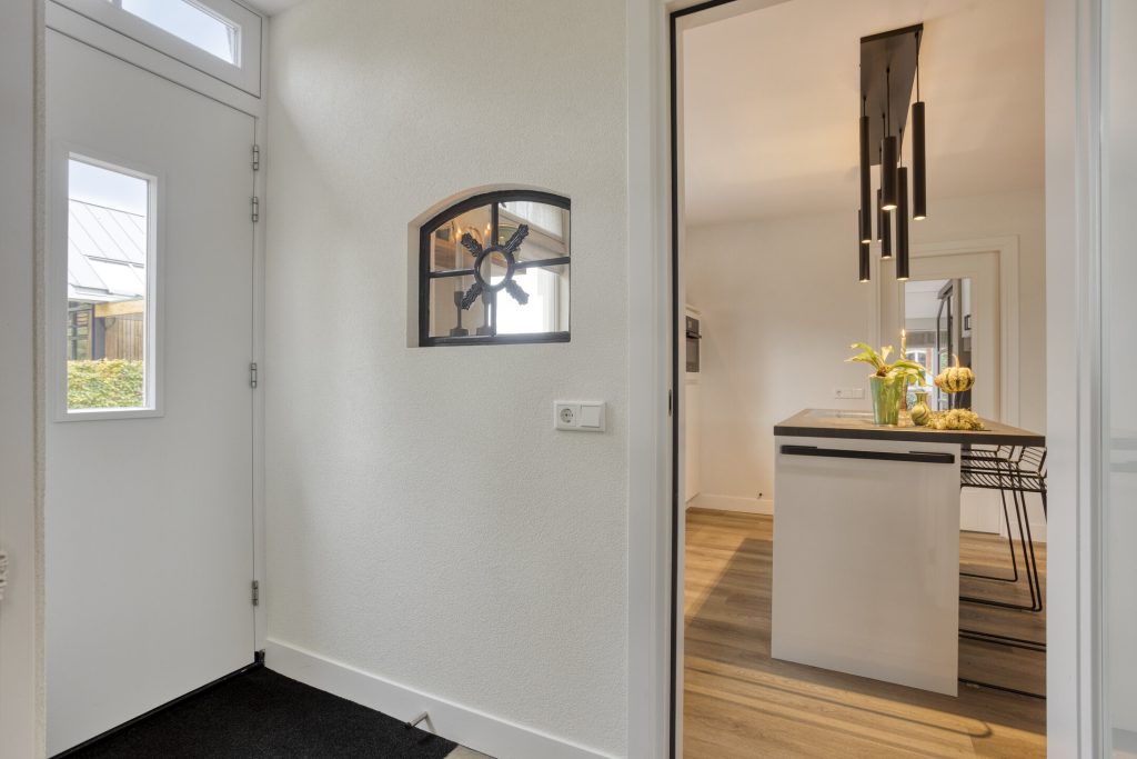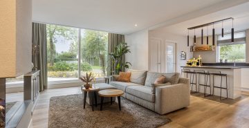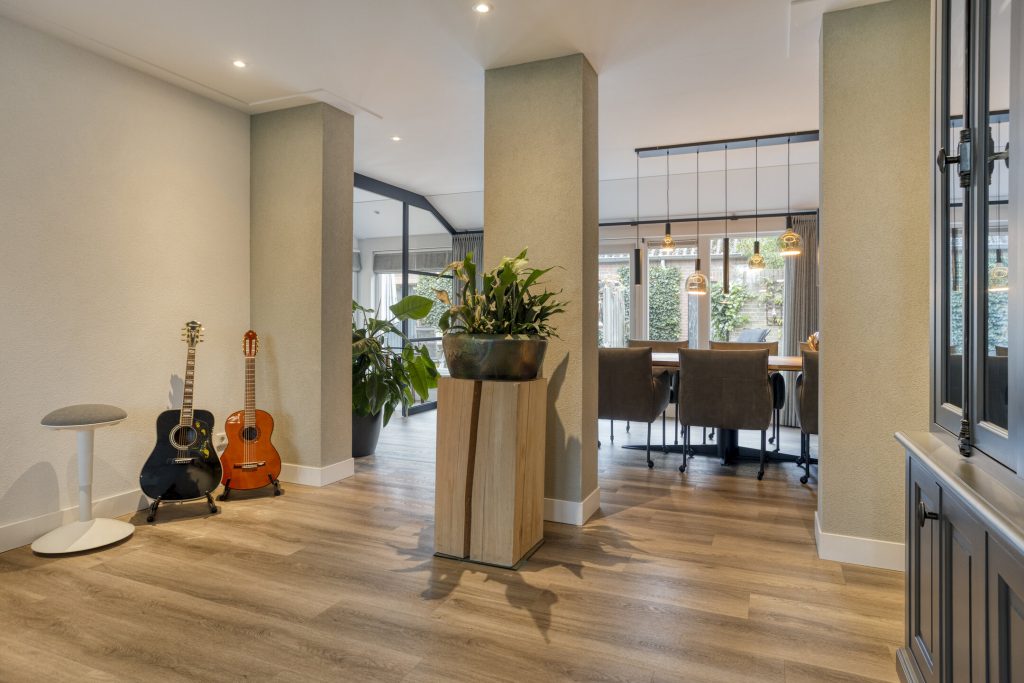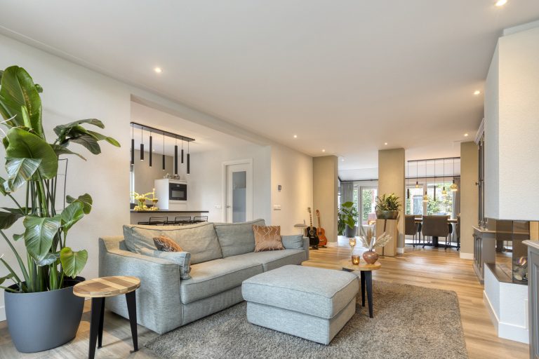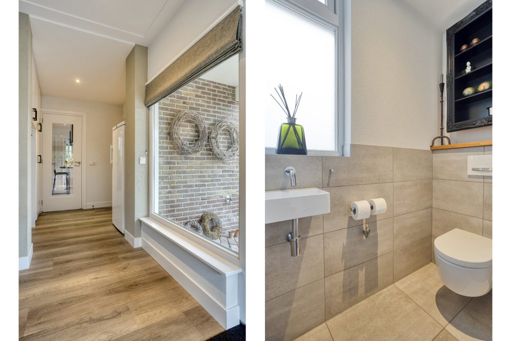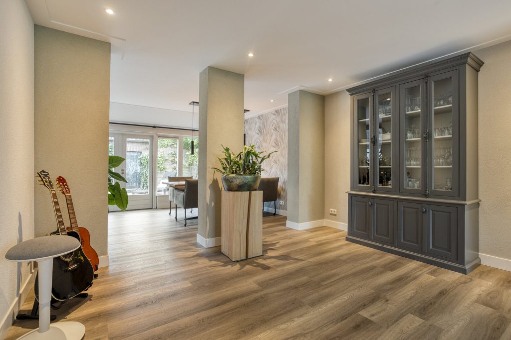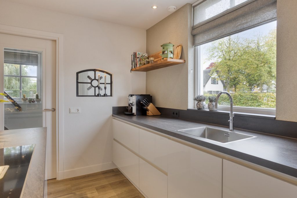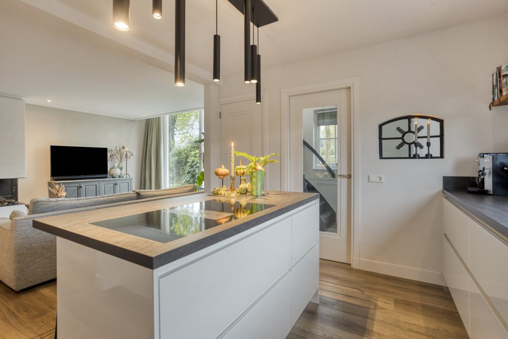 Via de hal met meterkast en trapopgang betreed je de woning. De open, moderne keuken vormt het hart van het huis. De keuken is voorzien van een kookeiland met inductiekookplaat met geïntrigeerde afzuiging en een vast keukenblok met een Quooker, oven en koelkast. Daarnaast is er een praktische kelderkast. Dit alles gecombineerd maakt dit de perfecte plek voor de kookliefhebber. De keuken loopt vloeiend over in de ruime woonkamer, waar grote ramen zorgen voor veel licht en de gashaard voor sfeer en warmte. Vanuit de gang met toiletruimte is de tuin bereikbaar. De afwerking is hoogwaardig en eigentijds: een strakke PVC-vloer met vloerverwarming, spachtelputz op de wanden en strak gestucte plafonds zorgen voor een moderne uitstraling.