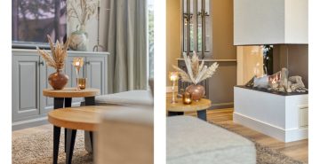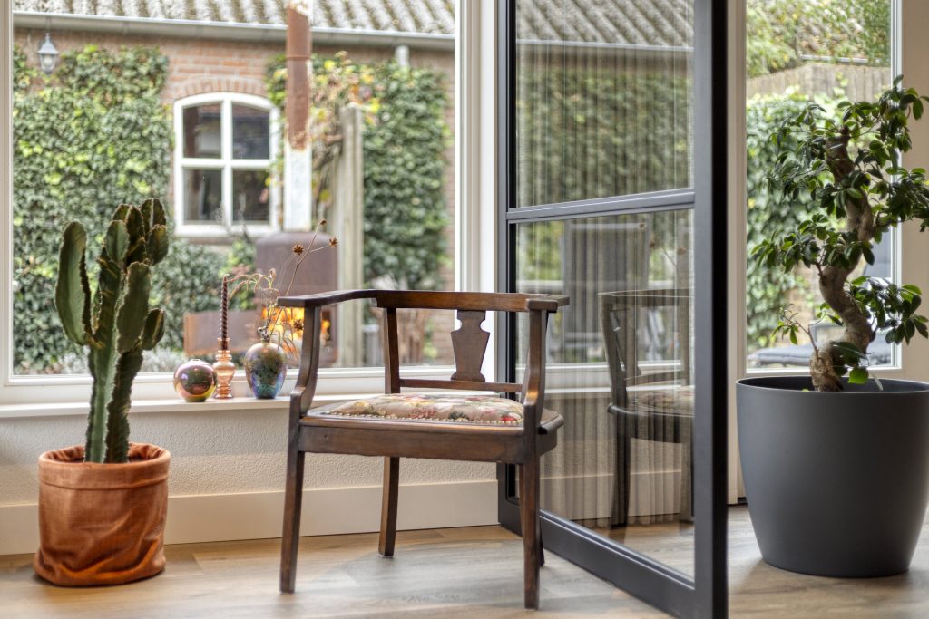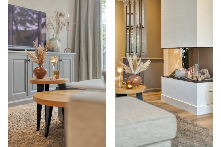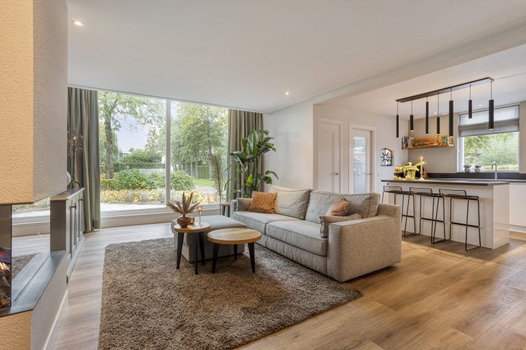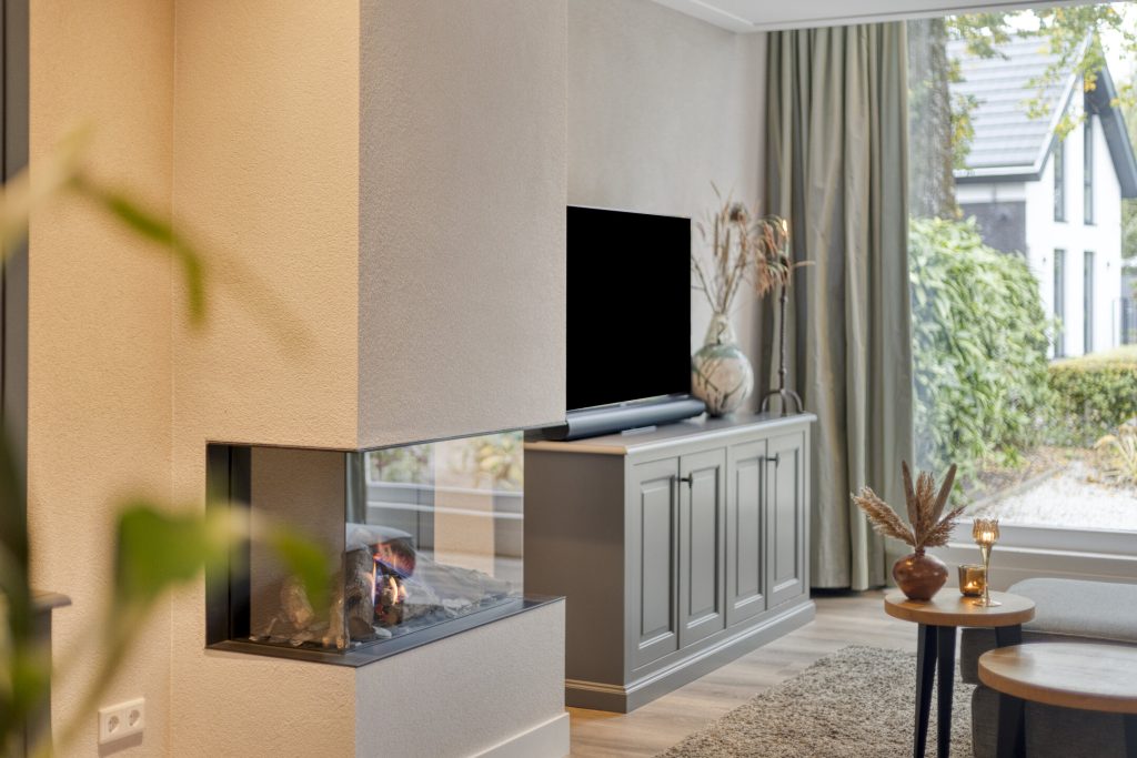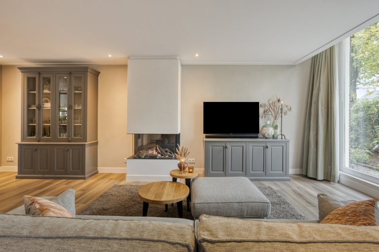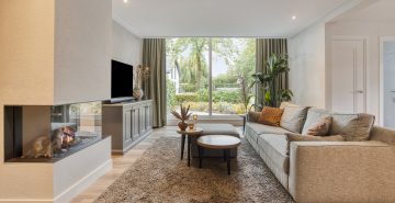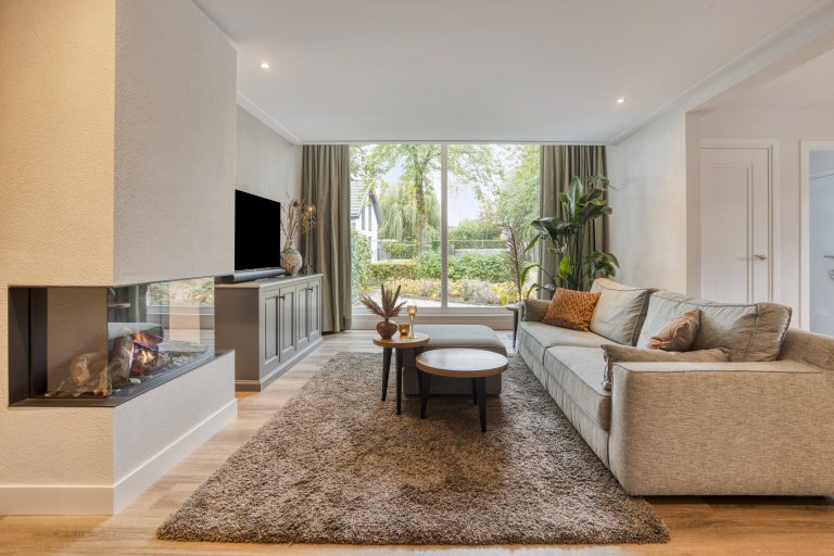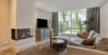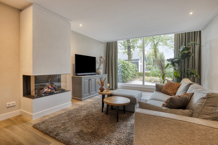 – Woonkamer met veel lichtinval en een gashaard