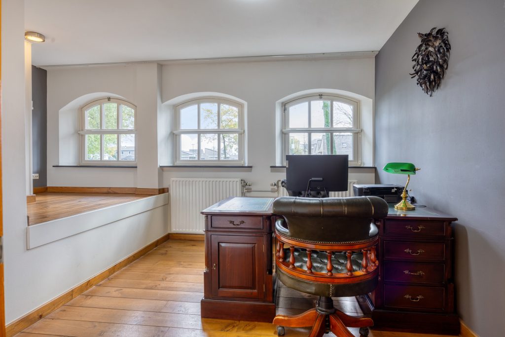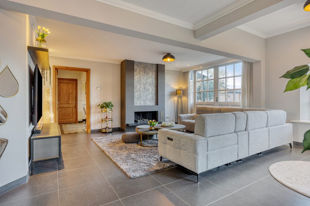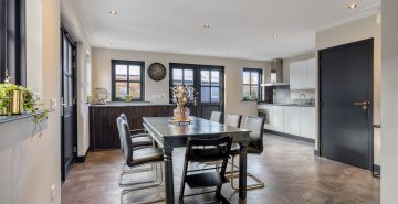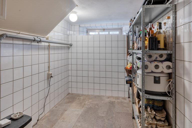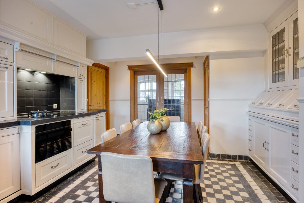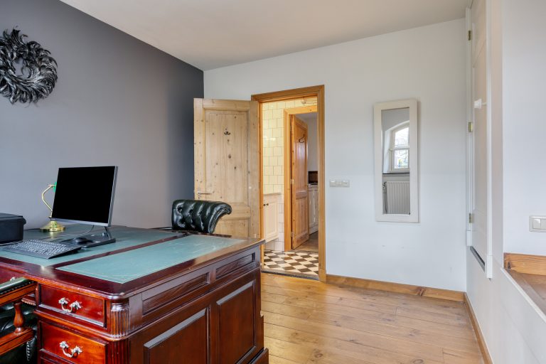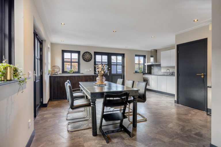 Bij binnenkomst in de hoofdwoning valt meteen de ruimtelijke opzet op. De royale entree, voorzien van meterkast en trapopgang, leidt naar het hart van de woning: de keuken. Deze is goed onderhouden en uitgerust met diverse inbouwapparatuur, waaronder een 4-pits inductiekookplaat met extra gaspit en afzuigkap, stoomoven, vaatwasser en koelkast. Een praktische kelder biedt volop ruimte voor voorraad en bewaren van proviand. Aansluitend bevindt zich de ruime en sfeervolle woonkamer, waar grote raampartijen en openslaande tuindeuren zorgen voor veel natuurlijk licht en een prettige verbinding met buiten. De gashaard vormt een warm middelpunt op koudere dagen. Aan de achterzijde van de woning geeft de hal toegang tot het toilet en de bijkeuken, voorzien van een keukenblok en witgoedaansluitingen. Hiernaast liggen de badkamer met douche en wastafelmeubel, en een slaapkamer die momenteel als kantoor wordt gebruikt.