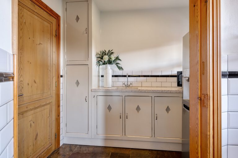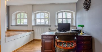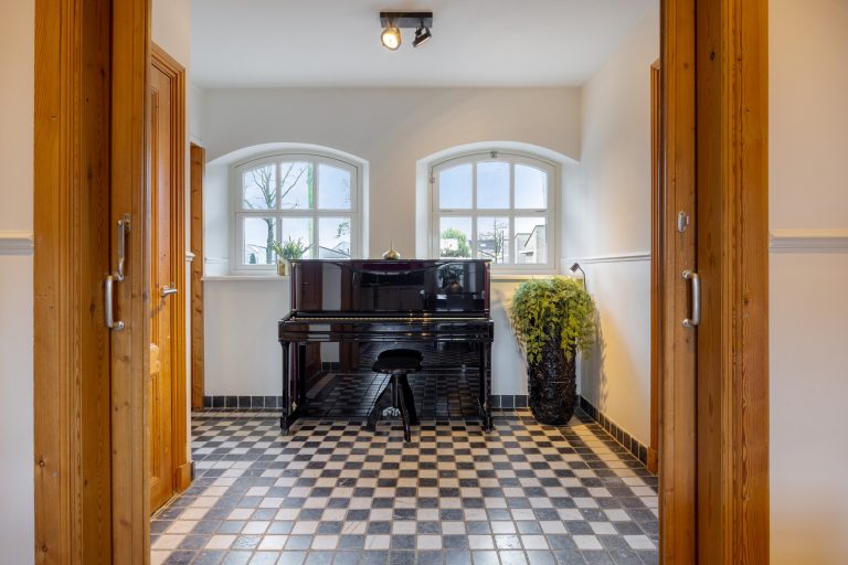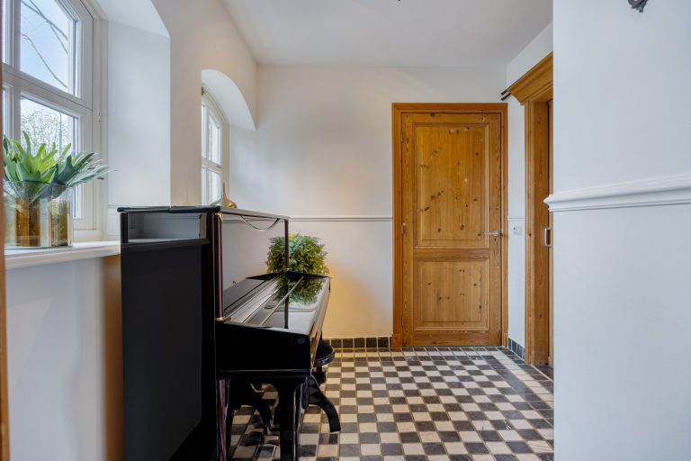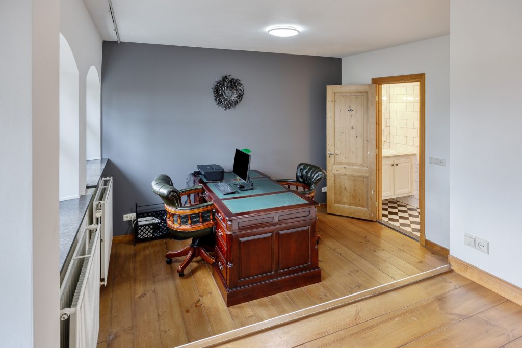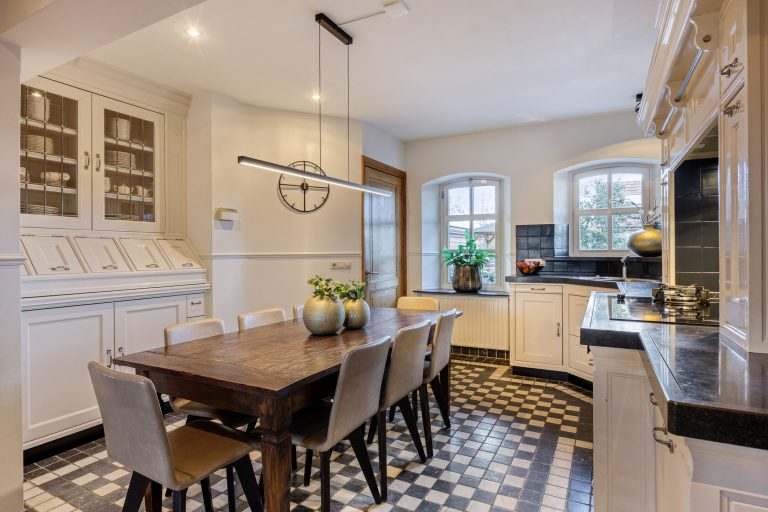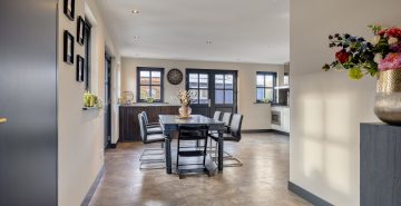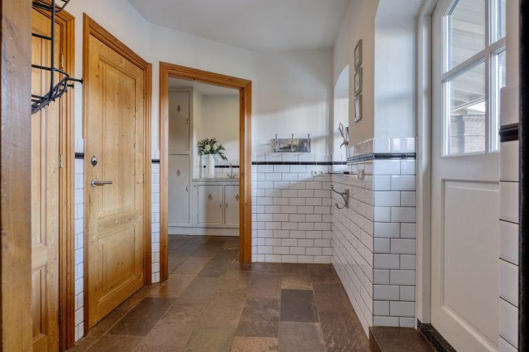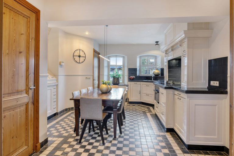 Bij binnenkomst in de hoofdwoning valt meteen de ruimtelijke opzet op. De royale entree, voorzien van meterkast en trapopgang, leidt naar het hart van de woning: de keuken. Deze is goed onderhouden en uitgerust met diverse inbouwapparatuur, waaronder een 4-pits inductiekookplaat met extra gaspit en afzuigkap, stoomoven, vaatwasser en koelkast. Een praktische kelder biedt volop ruimte voor voorraad en bewaren van proviand. Aansluitend bevindt zich de ruime en sfeervolle woonkamer, waar grote raampartijen en openslaande tuindeuren zorgen voor veel natuurlijk licht en een prettige verbinding met buiten. De gashaard vormt een warm middelpunt op koudere dagen. Aan de achterzijde van de woning geeft de hal toegang tot het toilet en de bijkeuken, voorzien van een keukenblok en witgoedaansluitingen. Hiernaast liggen de badkamer met douche en wastafelmeubel, en een slaapkamer die momenteel als kantoor wordt gebruikt.
