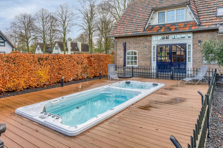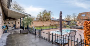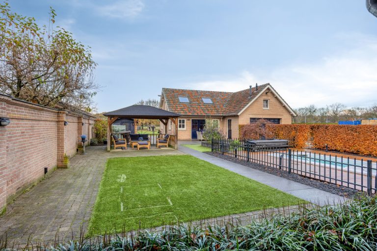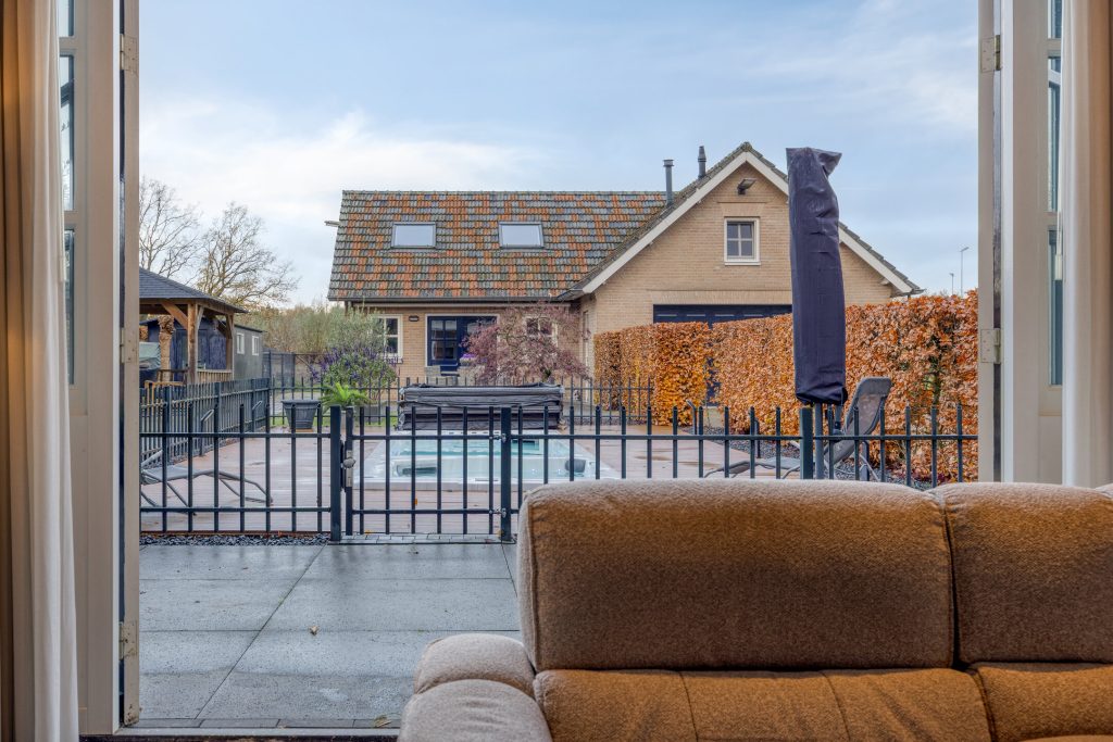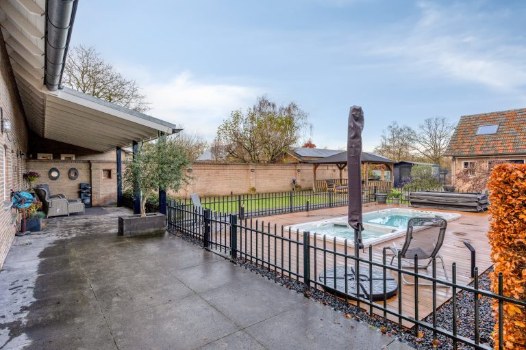 De achtertuin is een heerlijke plek om te genieten van rust en privacy. De tuin is strak onderhouden en verzorgd aangelegd met diverse (overdekte) zitgedeeltes, fraaie bestrating en een groen gazon. Sfeervolle tuinverlichting zorgt ervoor dat je hier ook ’s avonds fijn kunt verblijven. Een absolute blikvanger is de zeer ruime zwemjacuzzi; een perfecte plek om te ontspannen na een drukke dag. De vrijstaande berging maakt het geheel helemaal af. Deze berging is voorzien van elektra en biedt meer dan voldoende opbergruimte.
