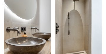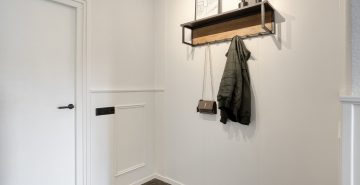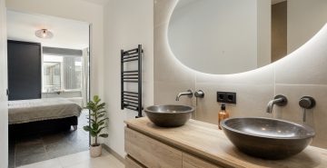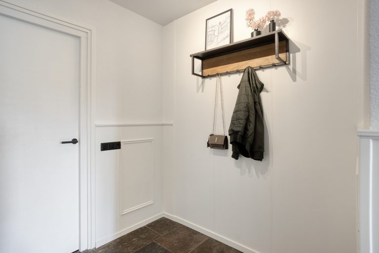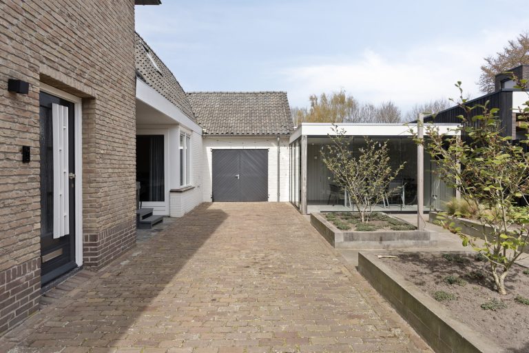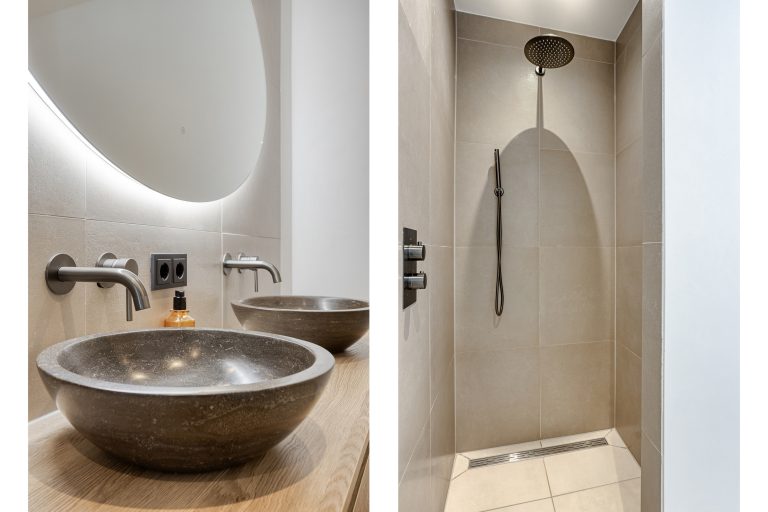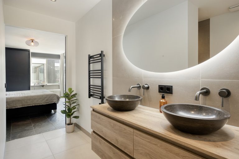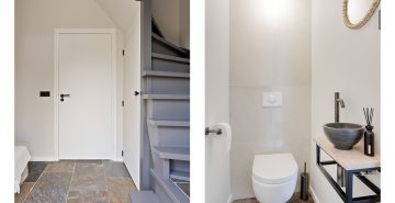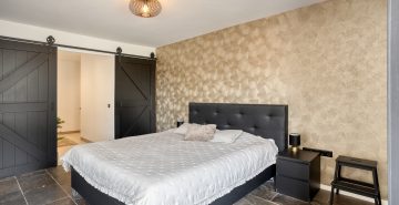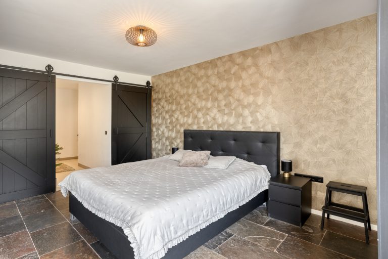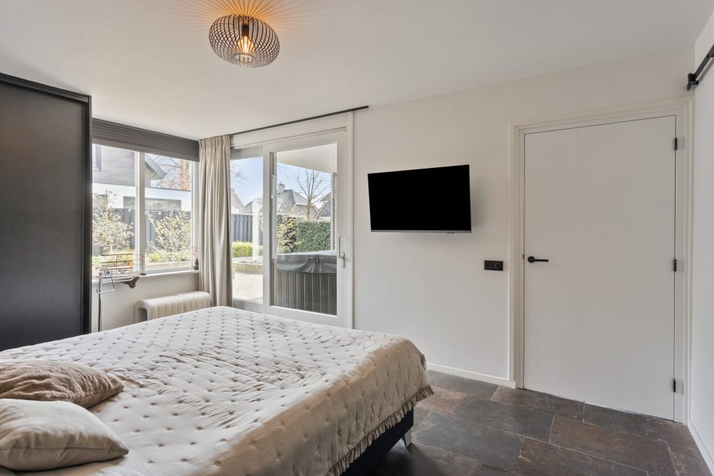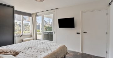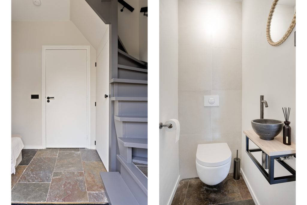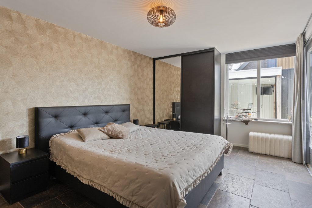 Aan de andere zijde van de keuken bevindt zich een portaal. Hier vind je een praktische bergkast, de moderne toiletruimte met zwevend toilet en fonteintje, en toegang tot zowel de overkapping als de slaapkamer op de begane grond. De slaapkamer op de begane grond is royaal en comfortabel ingericht, met een ingebouwde kastruimte. Dankzij de schuifpui naar de overkapping staat deze ruimte in directe verbinding met de tuin, wat zorgt voor een heerlijk binnen-buitengevoel. Aansluitend bevindt zich de ensuite badkamer, die samen met de kastruimte stijlvol is af te scheiden middels loftdeuren. De in 2025 vernieuwde badkamer is strak en luxe afgewerkt en voorzien van een inloopdouche, dubbele wastafel met meubel en een zwevend toilet. Zowel de slaapkamer als de badkamer zijn uitgerust met vloerverwarming. De gehele begane grond, met uitzondering van de badkamer, is afgewerkt met een stijlvolle leistenen vloer die zorgt voor een rustige en moderne basis.