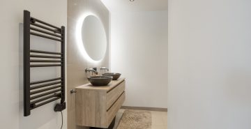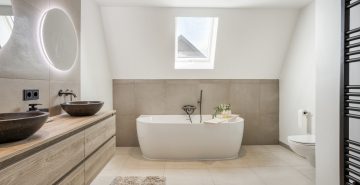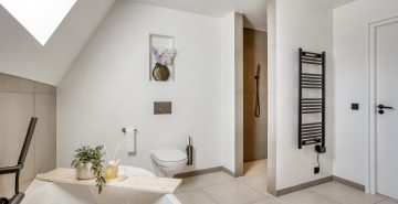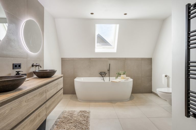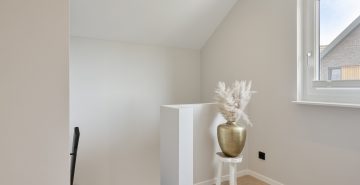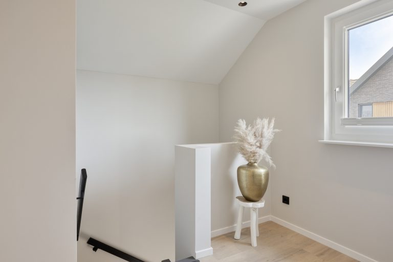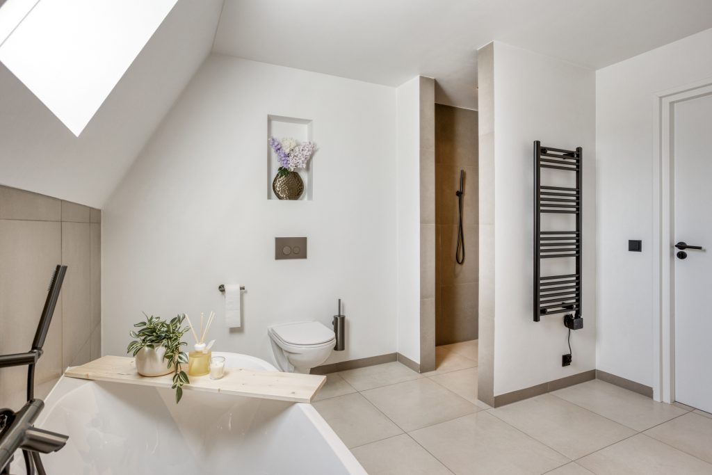 Daarnaast beschikt deze verdieping over een tweede, zeer ruime badkamer. Deze is eveneens gemoderniseerd en luxe uitgevoerd met een ligbad, inloopdouche, dubbele wastafel met meubel en een zwevend toilet. De oorspronkelijke badkamer is omgebouwd tot een separate wasruimte. Hier bevinden zich de aansluitingen voor het witgoed en de mechanische ventilatie-unit. Vanaf de overloop is via een vlizo de bergzolder bereikbaar, ideaal voor het opbergen van bijvoorbeeld de seizoensspullen.