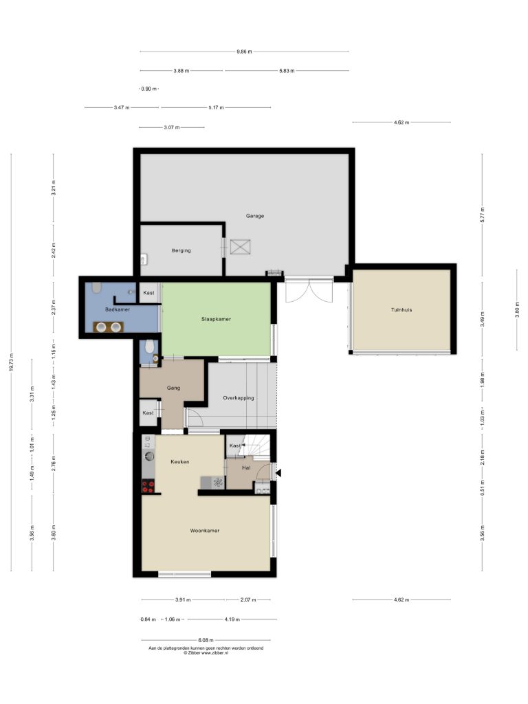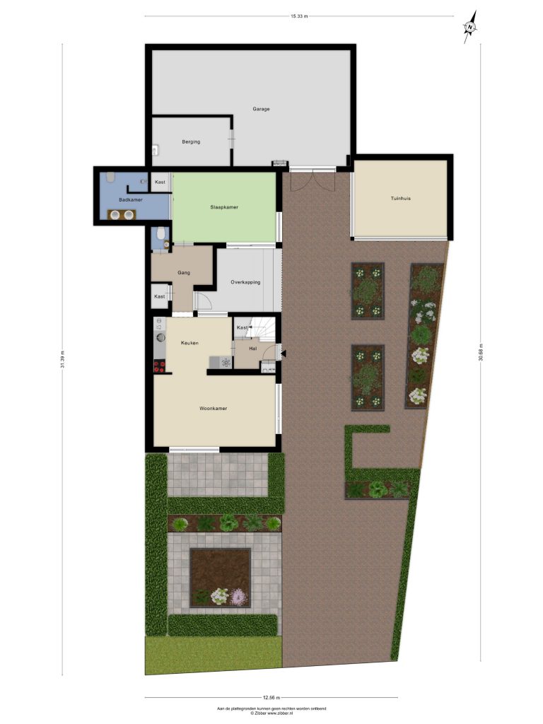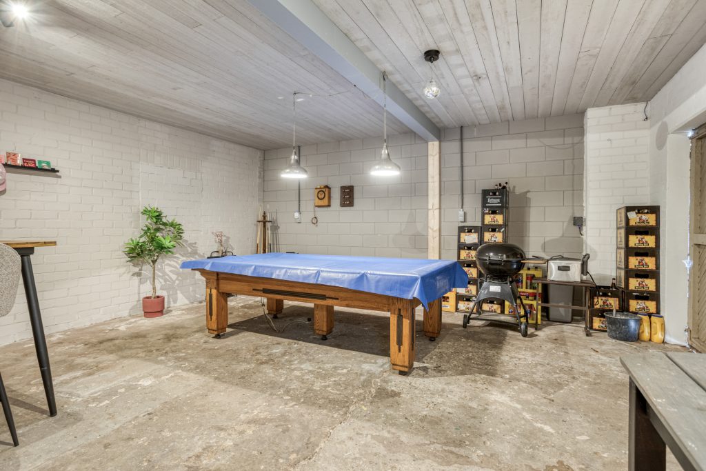 Via de tuin heb je toegang tot de royale garage. Deze multifunctionele ruimte is voorzien van elektra, water en een eigen meterkast. In de garage bevindt zich een praktische bergruimte met de cv-opstelling, de omvormer van de zonnepanelen en de verdeler van de vloerverwarming van het woonhuis. Tevens is de garage voorzien van een volwaardige verdieping, bereikbaar via een luik, die uitstekend te gebruiken is als extra bergruimte of voor andere doeleinden.