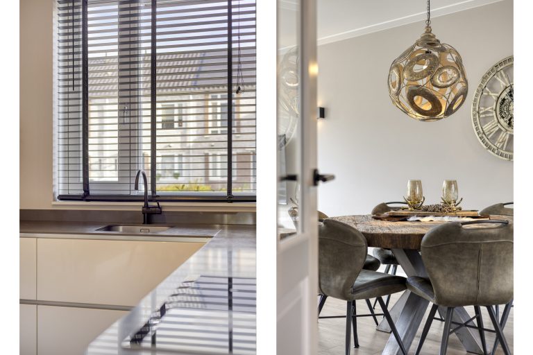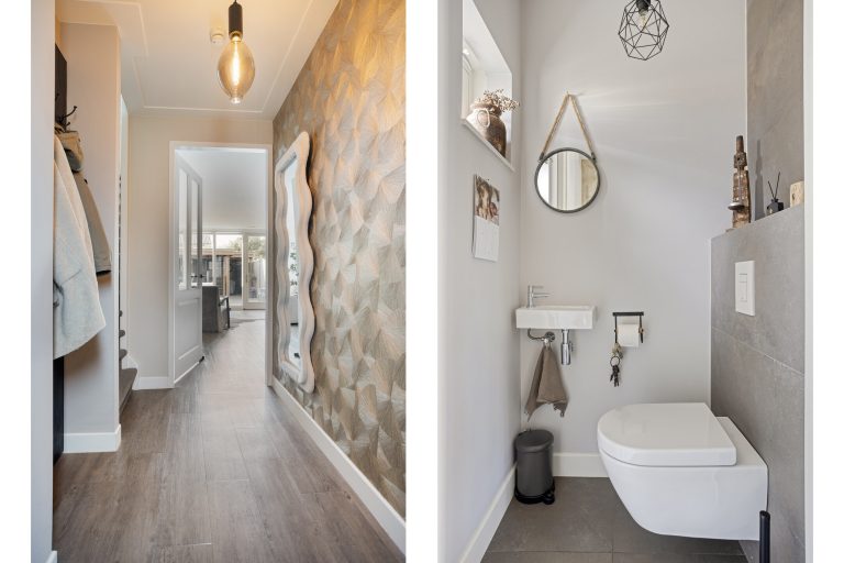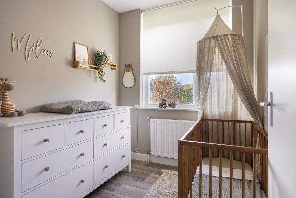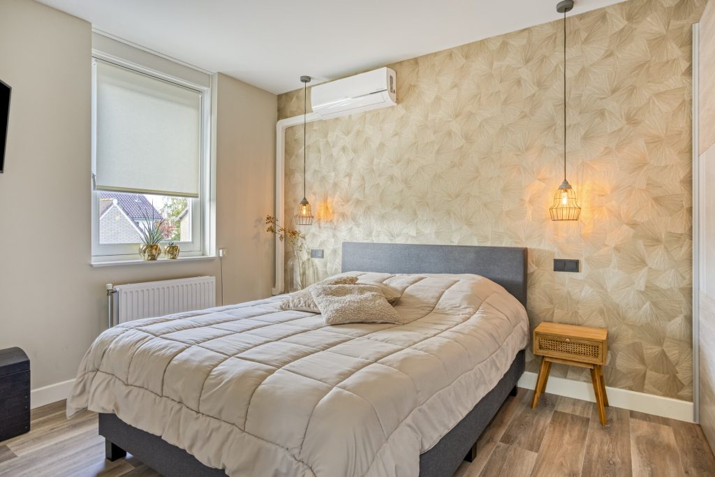 Op de eerste verdieping bevinden zich drie keurige slaapkamers en een eigentijdse badkamer met inloopdouche, toilet, wastafel met badmeubel en vloerverwarming. Een prettige ruimte waar je de dag ontspannen begint of afsluit. Voor extra comfort zijn de slaapkamers voorzien van rolluiken, terwijl de begane grond een modieus zonnescreen heeft dat het zonlicht op stijlvolle wijze filtert.