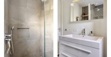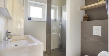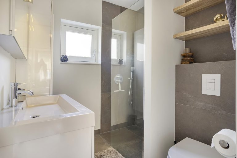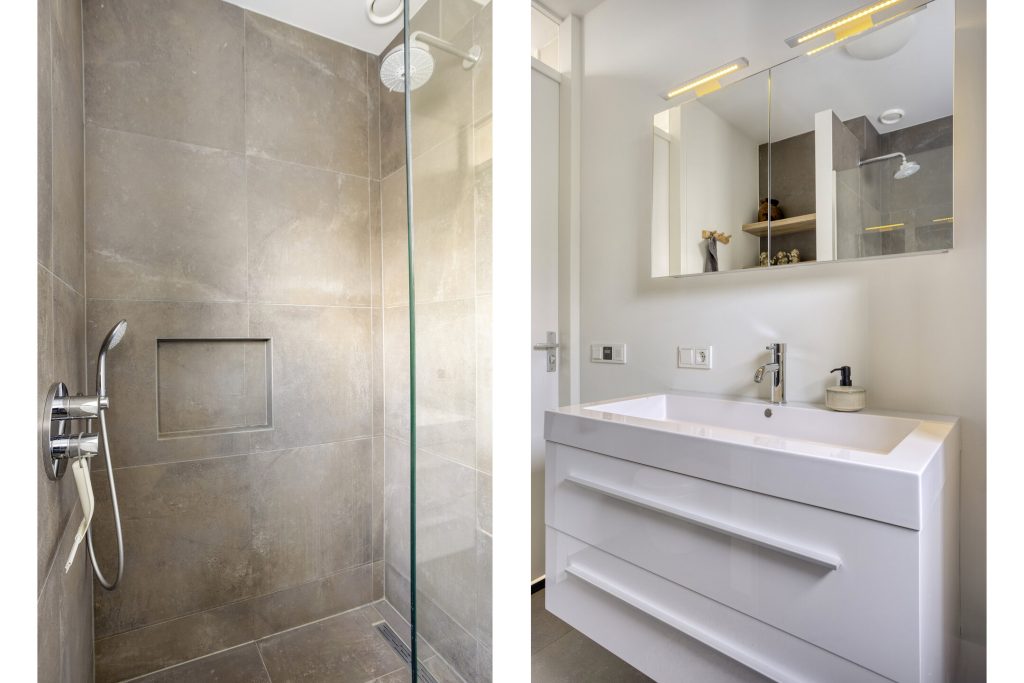 – Badkamer met inloopdouche, toilet, wastafel met badmeubel en vloerverwarming