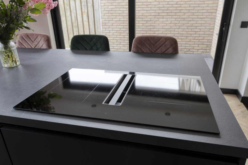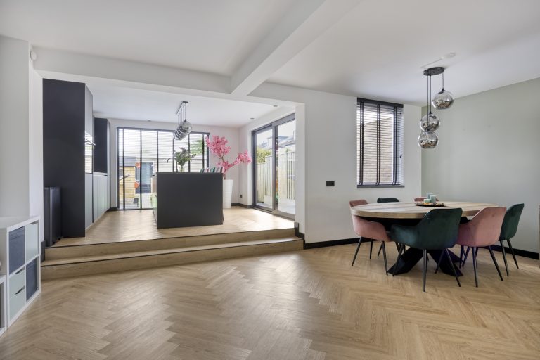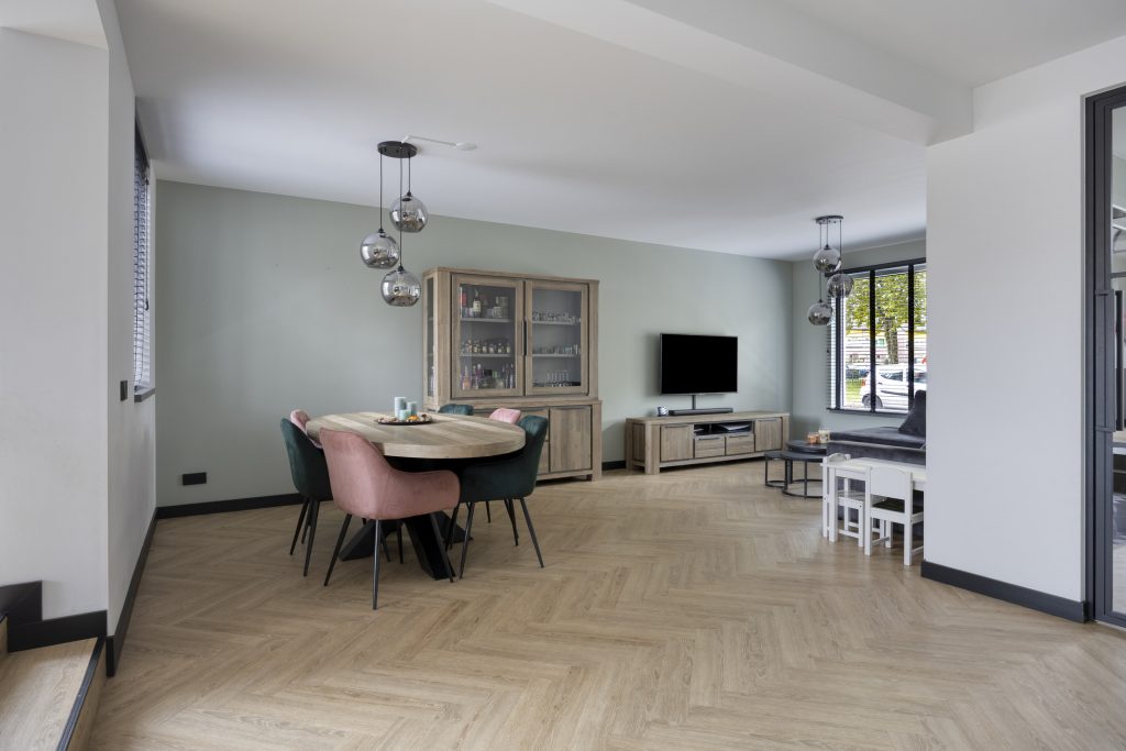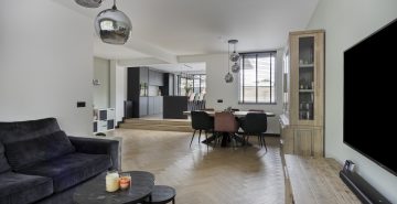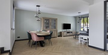 Zodra je binnenstapt, valt het oog direct op de prachtige stalen deur die de woonkamer een stijlvolle uitstraling geeft. De ruimte voelt licht, fris en uitnodigend aan. De open keuken, vernieuwd in 2023, vormt het hart van het huis en is uitgevoerd met een modern keukenmeubel en hoogwaardige inbouwapparatuur, waaronder een 4-pits inductiekookplaat met geïntegreerde afzuiging, een combi-oven, vaatwasser en koel-/vriescombinatie. Hier is koken niet zomaar een dagelijkse bezigheid, maar een plezierige ervaring.