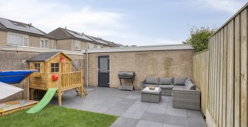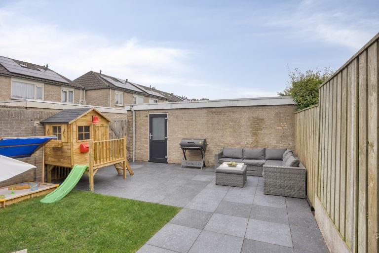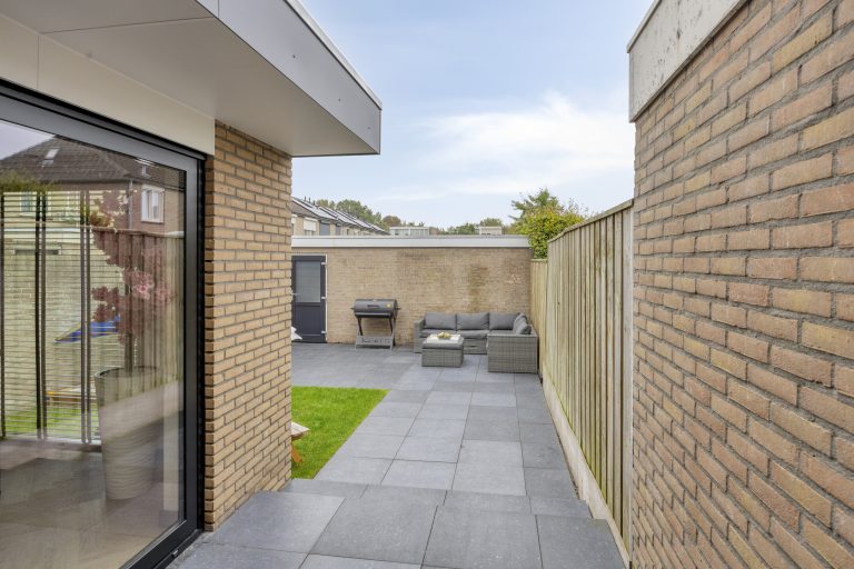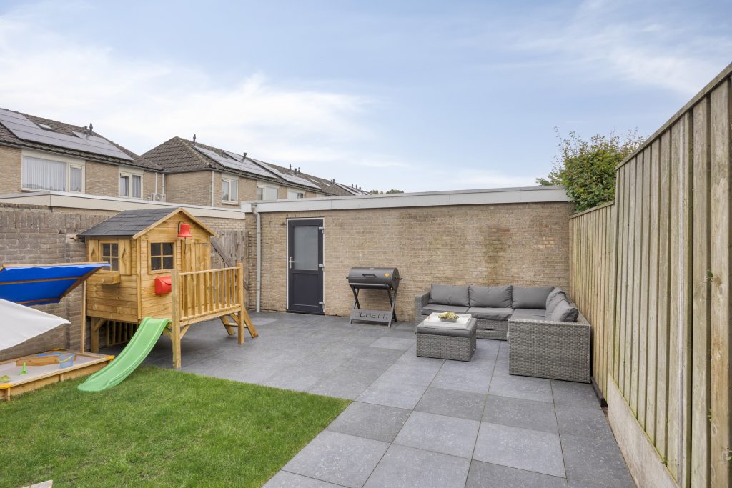 De achtertuin, gelegen op het noordoosten, is volledig omsloten en biedt volop privacy. Dankzij de achterom is de tuin ook praktisch in gebruik, terwijl de vrijstaande stenen garage, voorzien van water en elektra, perfect is voor de hobbyist of als extra bergruimte.