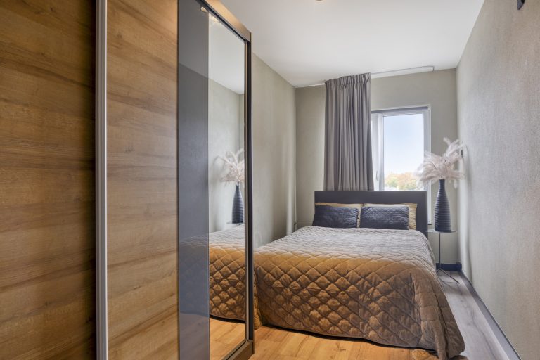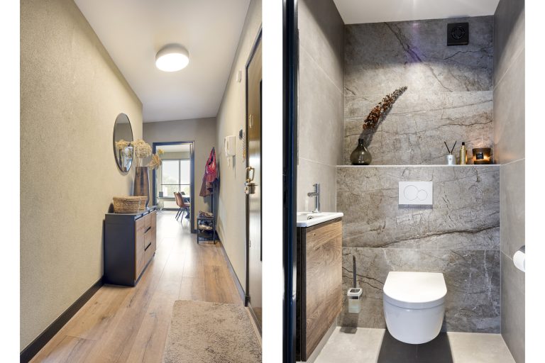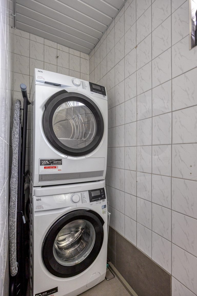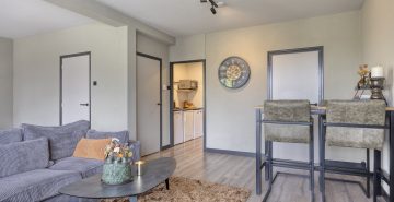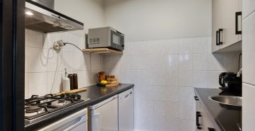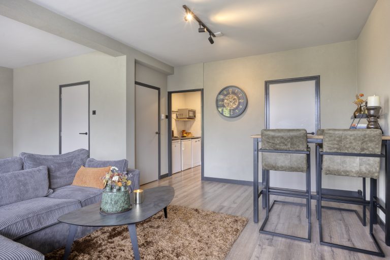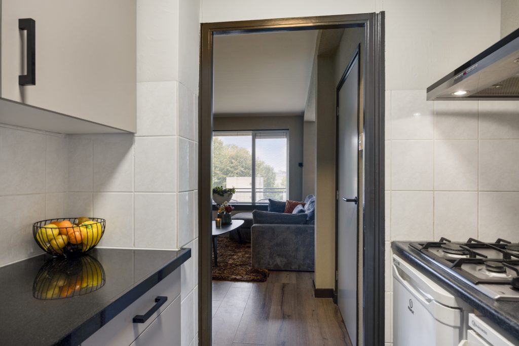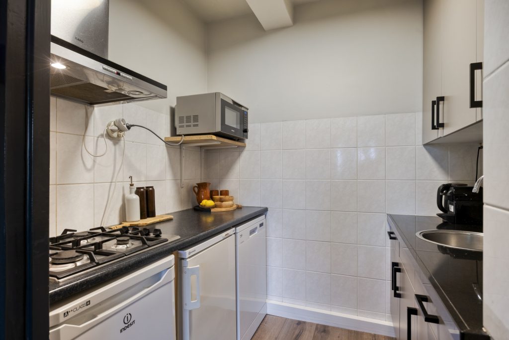 De hal geeft toegang tot het vernieuwde toilet, de meterkast en een praktische wasruimte met plaats voor de wasmachine, droger en de cv-installatie. De woonkamer is keurig afgewerkt met een laminaatvloer en strak stucwerk. Hier geniet je van veel natuurlijk licht dankzij de grote raampartijen. Vanuit hier is het balkon bereikbaar, waar je heerlijk buiten kunt zitten. De halfopen keuken is voorzien van een ingebouwd 4-pits gasfornuis met afzuigkap en beschikt daarnaast over een losse vaatwasser, koelkast en combimagnetron. De slaapkamer is eveneens netjes afgewerkt met laminaatvloer en stucwerk. De badkamer, vernieuwd in 2020, is volledig betegeld en ingedeeld met een ligbad, inloopdouche, wastafelmeubel en designradiator; een stijlvolle en comfortabele ruimte om de dag te beginnen of af te sluiten.
