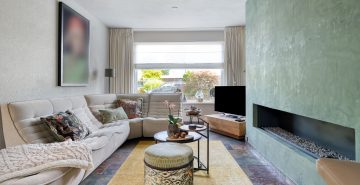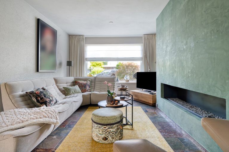 – Royale woonkamer met openslaande tuindeuren en een sfeervolle gashaard