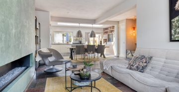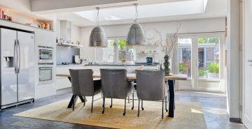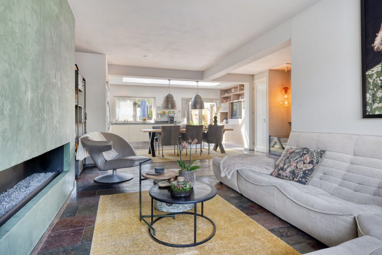 De royale woonkamer is een heerlijke leefruimte met veel lichtinval, openslaande tuindeuren naar het terras en een sfeervolle gashaard die het hart van het huis vormt. De open keuken is een echte eyecatcher: modern, strak en van alle denkbare luxe voorzien, waaronder een 5-pits gaskookplaat, Quooker, combi-oven, vaatwasser en een koel-/vriescombinatie.