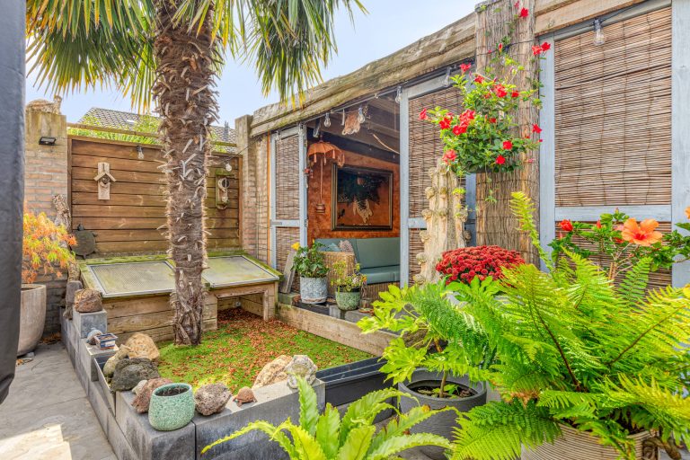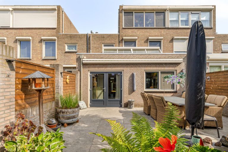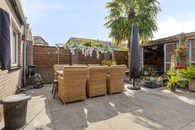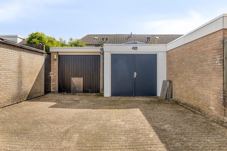 De achtertuin ligt op het westen en is volledig afgescheiden, met achterom. Hier kun je tot in de late uurtjes genieten van de avondzon. Extra praktisch is de vrijstaande garage met elektra. Deze is perfect voor hobby, opslag of parkeren.