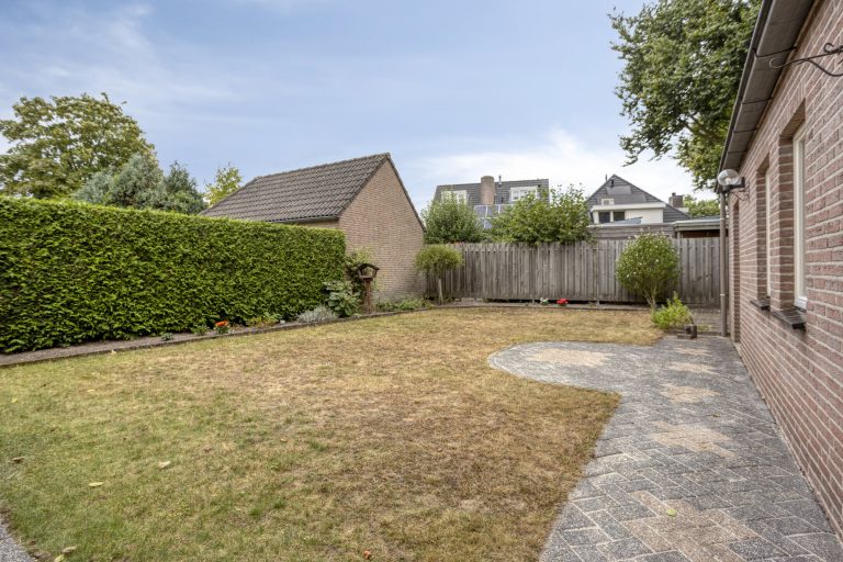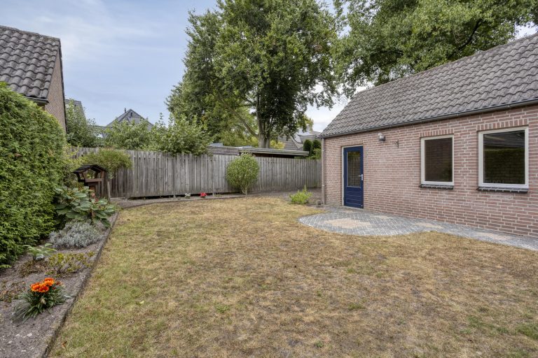 Ook buiten is het genieten. De achtertuin is bereikbaar via een achterom en biedt zowel een terras als gazon. Met de ligging op het noorden profiteer je hier van een fijne mix van zon en schaduw. De extra lange oprit en de vrijstaande garage maken het plaatje compleet. De garage is voorzien van elektra, dubbel glas, een elektrische roldeur, loopdeur én een vliering.
