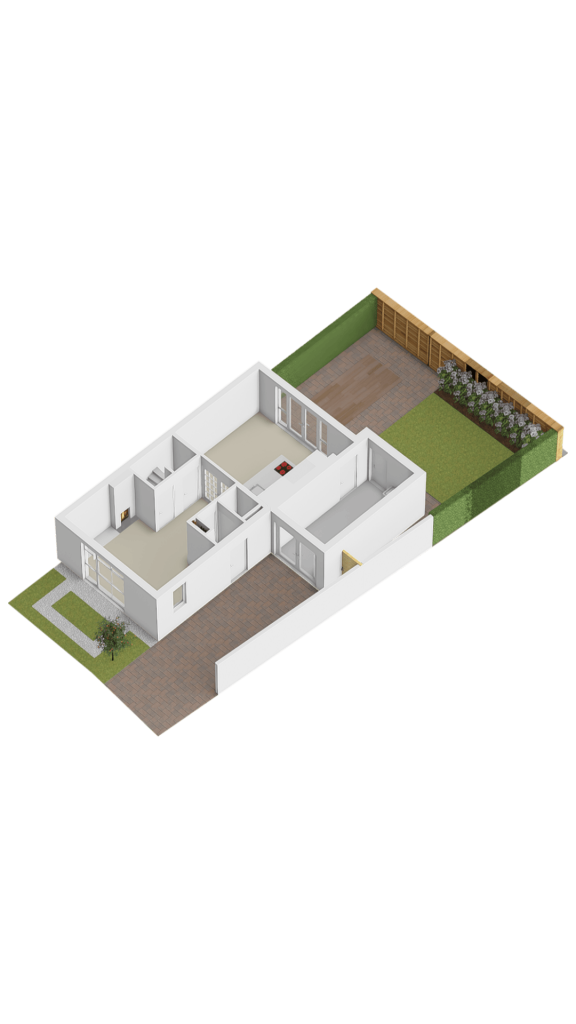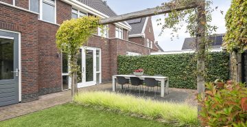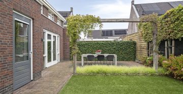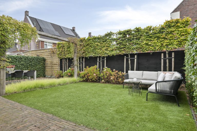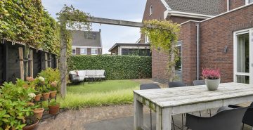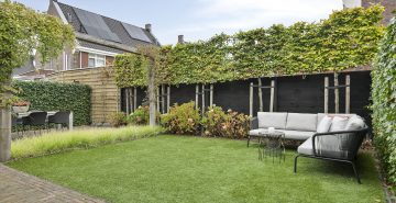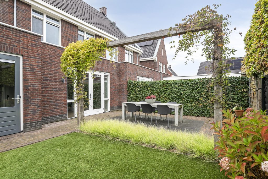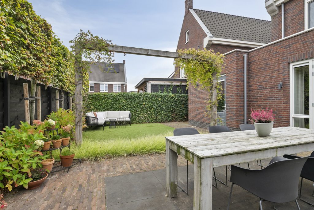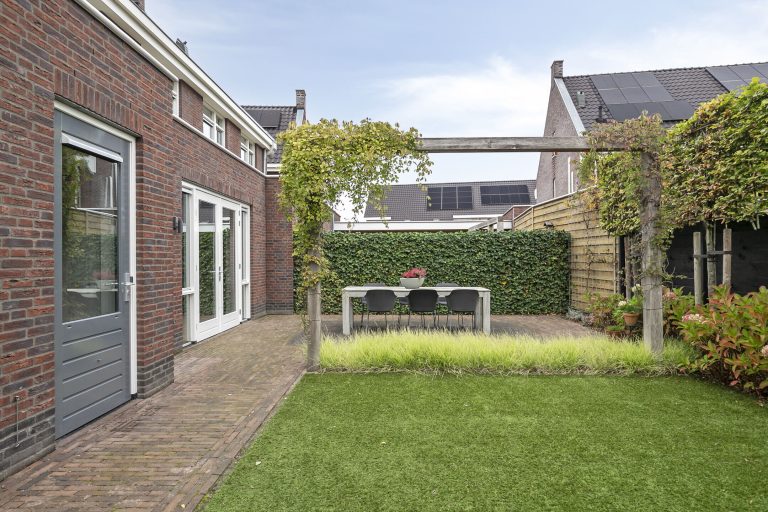 De achtertuin, gelegen op het noordoosten, is met zorg aangelegd en volledig afgescheiden voor optimale privacy. De tuin is achterom bereikbaar via de poort aan de zijkant van de woning. In de tuin kun je heerlijk genieten van de zon op een van de (verharde) terrassen, terwijl de kinderen veilig spelen op het kunstgras. De borders met beplanting zorgen voor een groene sfeer, en praktische details als tuinverlichting en een buitenkraan maken het geheel compleet.