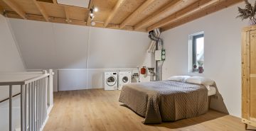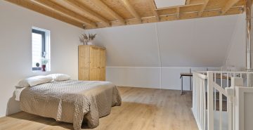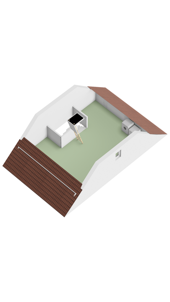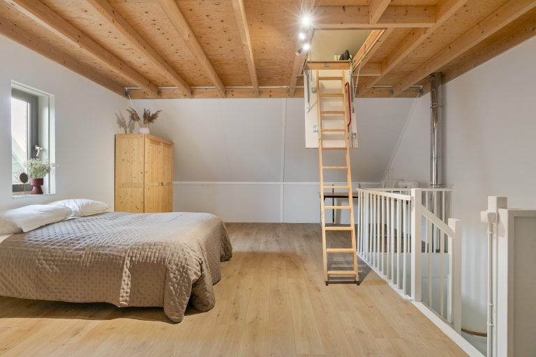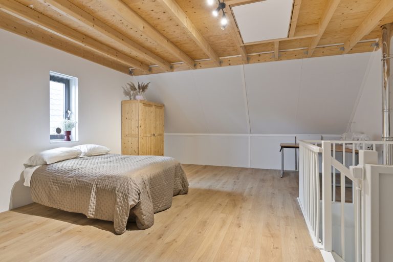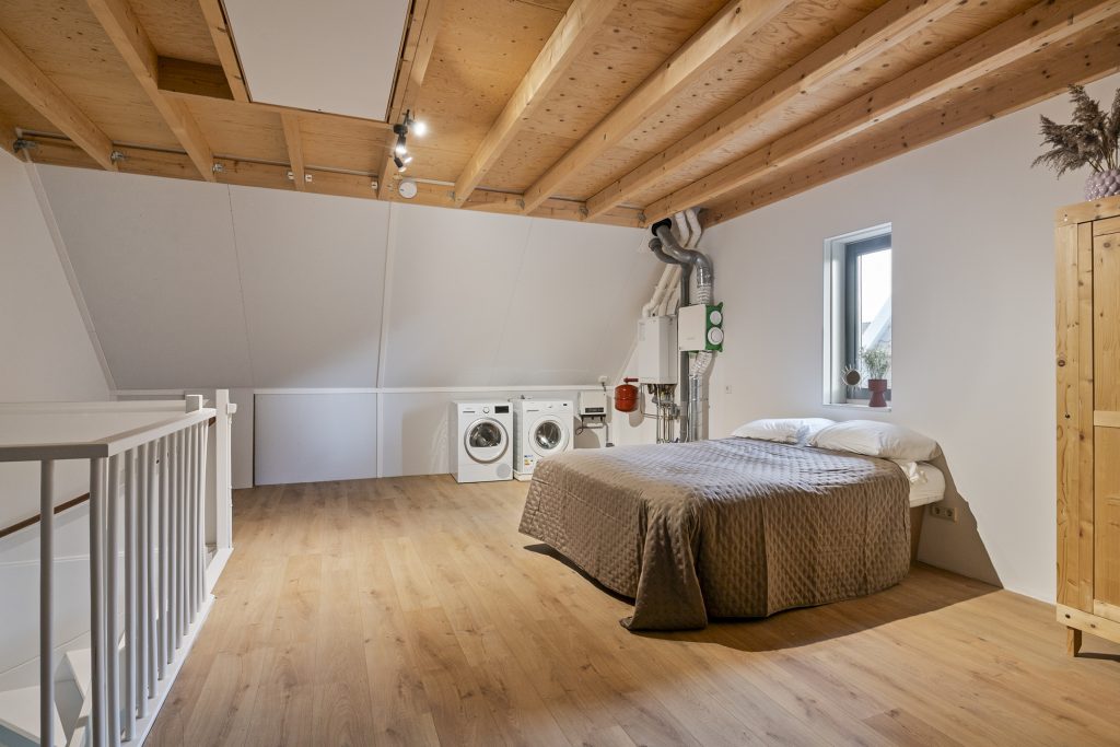 De tweede verdieping is via een vaste trap bereikbaar en biedt een grote open ruimte die momenteel als slaapkamer wordt gebruikt, maar ook perfect dienst kan doen als werk- of speelruimte. Hier bevinden zich tevens de cv-installatie, witgoedaansluitingen, mv-unit en de omvormer voor de zonnepanelen. Via een vlizotrap is de praktische bergzolder op de derde verdieping te bereiken; ideaal voor het opbergen van seizoensspullen.