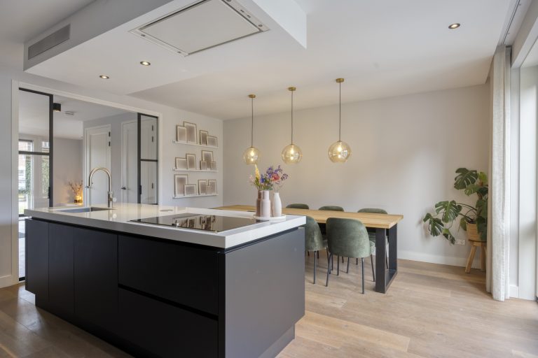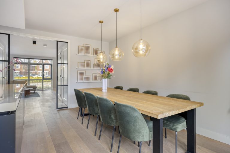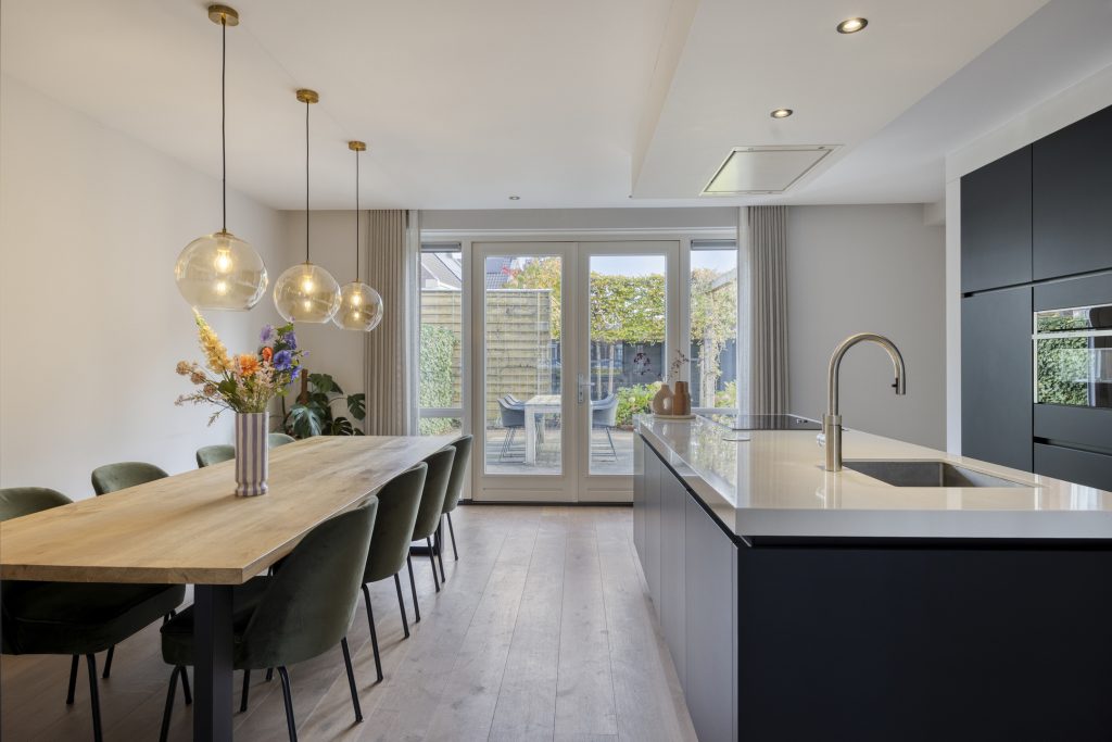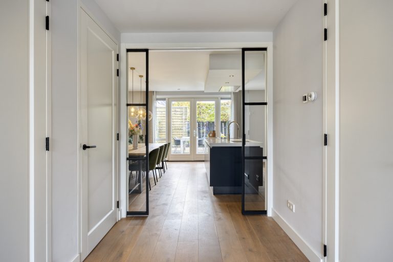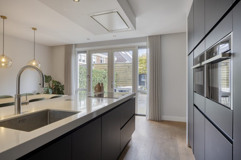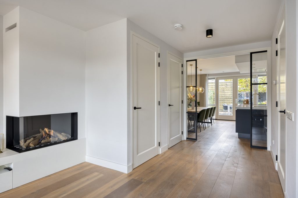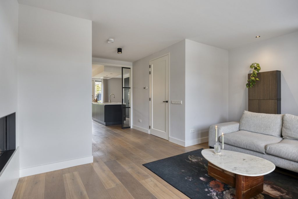 Bij binnenkomst valt direct de verzorgde afwerking op. De hal biedt toegang tot het toilet en de meterkast. De ruime woonkamer is licht en sfeervol, met grote ramen en een gezellige gashaard als middelpunt. Onder de schuinte van de trap is er een handige voorraadkast. Via stijlvolle ensuite deuren bereik je de royale leefkeuken, die is ingericht met een modern kook- en spoeleiland en hoogwaardige inbouwapparatuur, waaronder een inductiekookplaat met afzuigkap, stoomoven, combi-oven, Quooker en vaatwasser. De openslaande deuren naar de tuin maken het woongenot compleet. De eikenhouten vloer en het strakke stucwerk op wanden en plafonds geven de begane grond een luxe uitstraling.