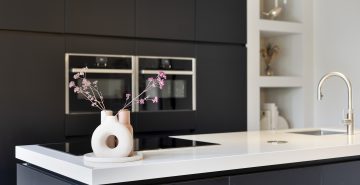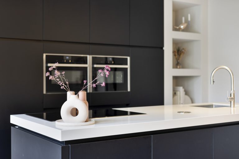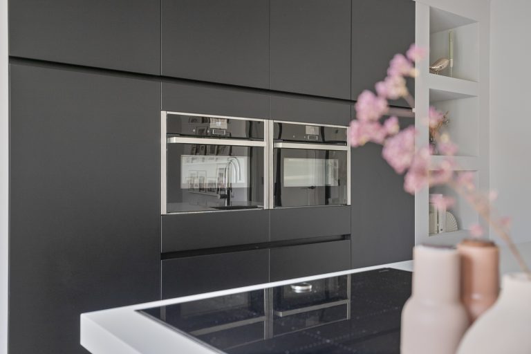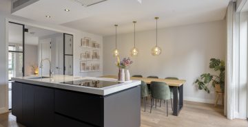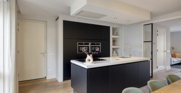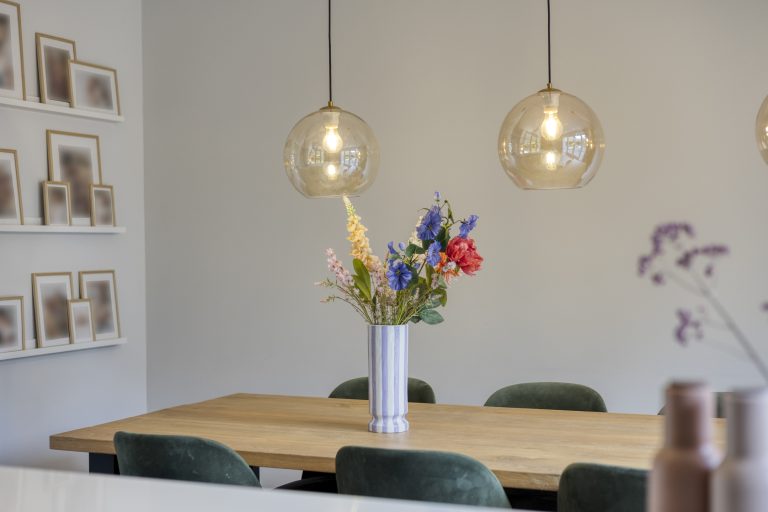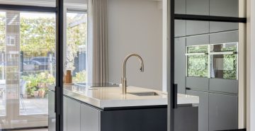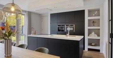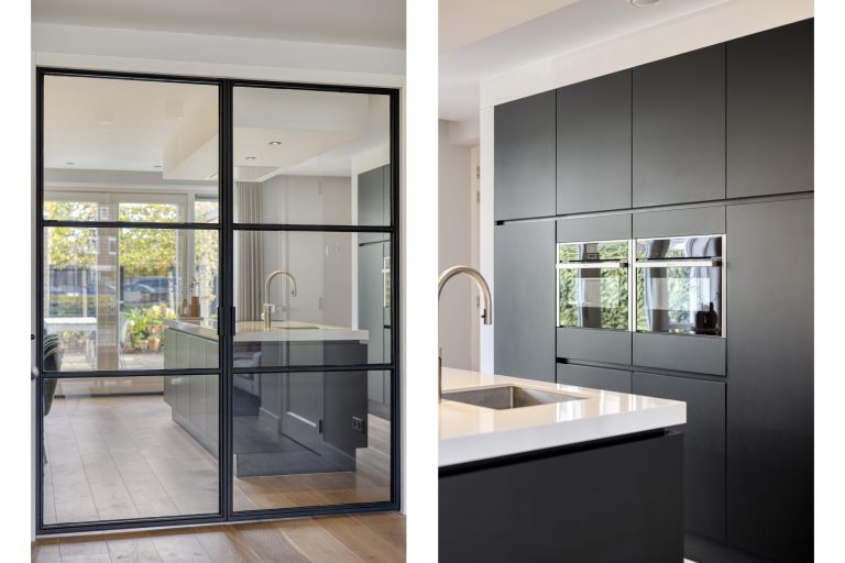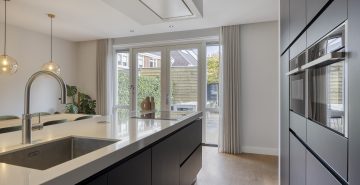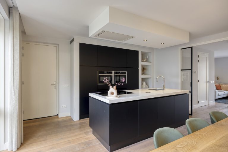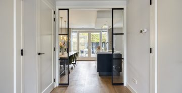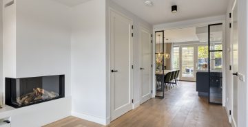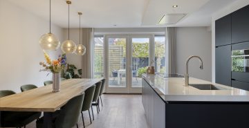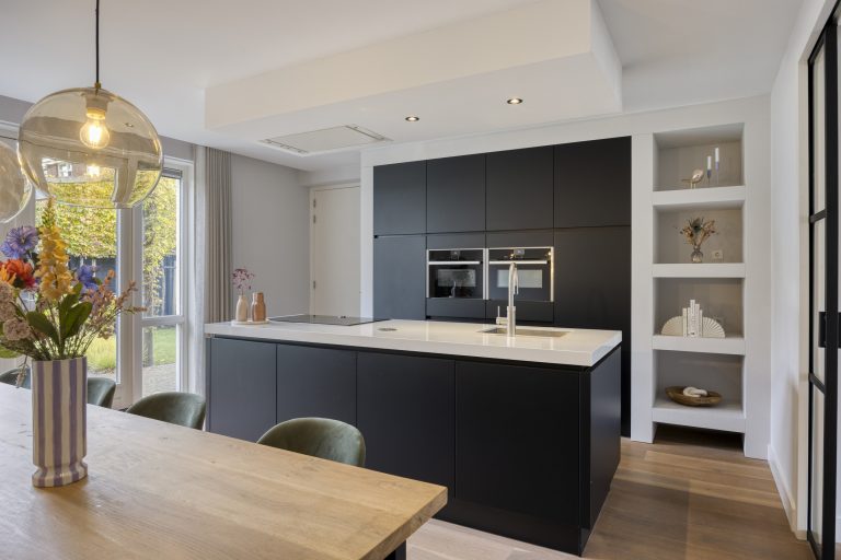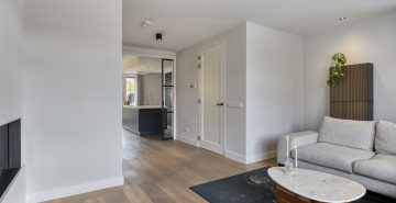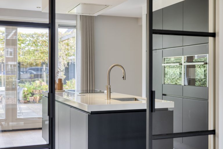 Bij binnenkomst valt direct de verzorgde afwerking op. De hal biedt toegang tot het toilet en de meterkast. De ruime woonkamer is licht en sfeervol, met grote ramen en een gezellige gashaard als middelpunt. Onder de schuinte van de trap is er een handige voorraadkast. Via stijlvolle ensuite deuren bereik je de royale leefkeuken, die is ingericht met een modern kook- en spoeleiland en hoogwaardige inbouwapparatuur, waaronder een inductiekookplaat met afzuigkap, stoomoven, combi-oven, Quooker en vaatwasser. De openslaande deuren naar de tuin maken het woongenot compleet. De eikenhouten vloer en het strakke stucwerk op wanden en plafonds geven de begane grond een luxe uitstraling.