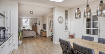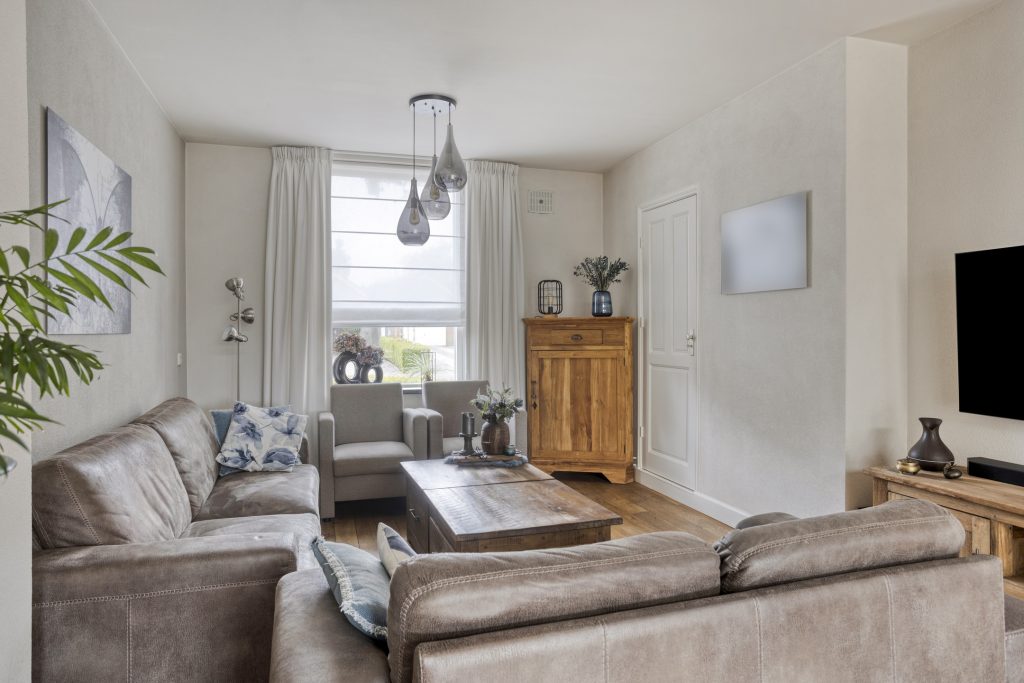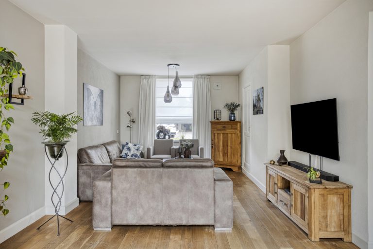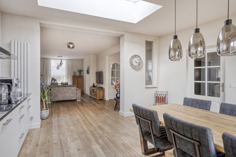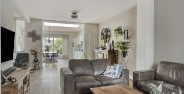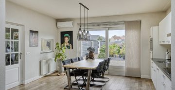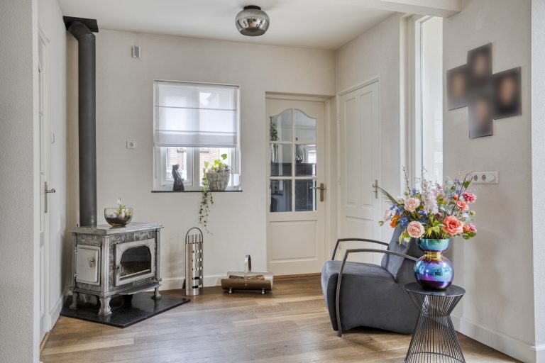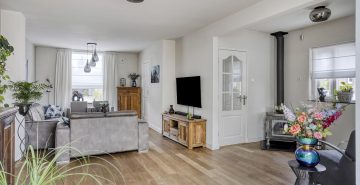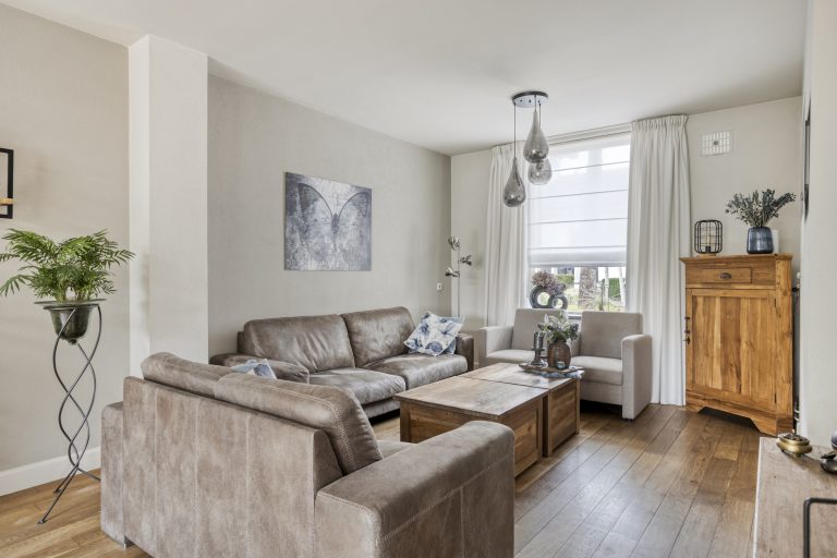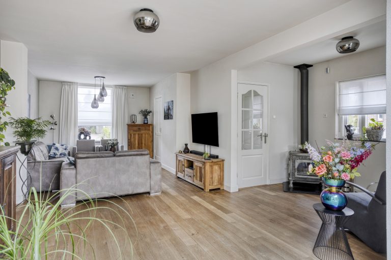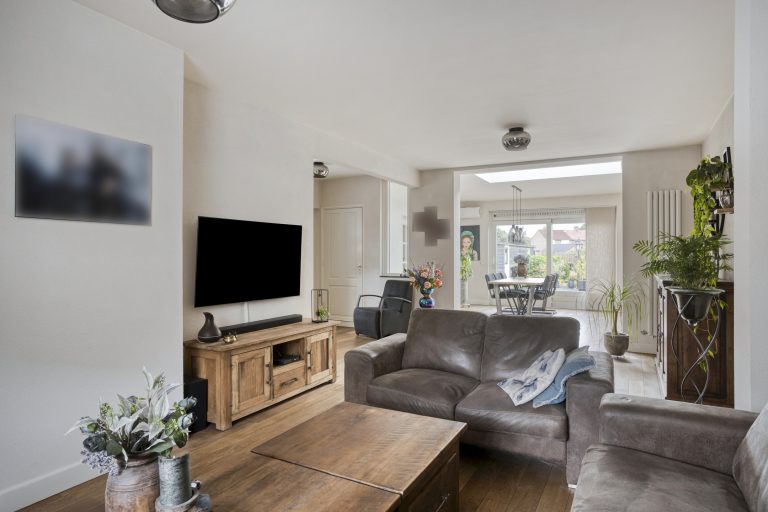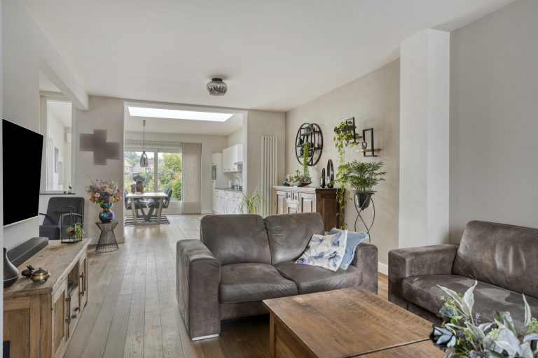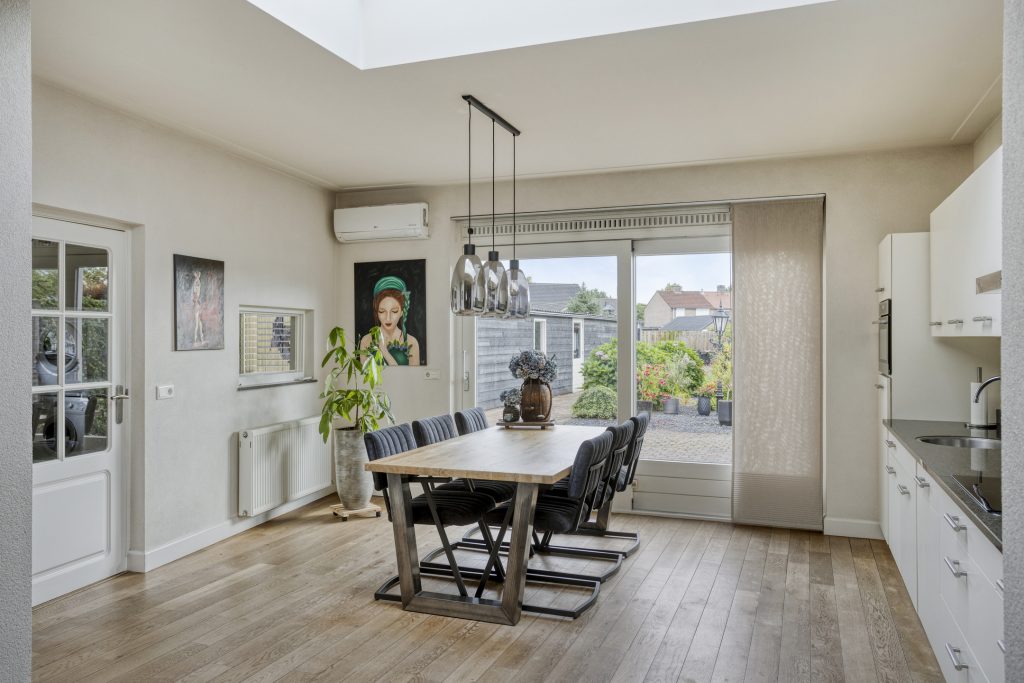 Ook binnenshuis straalt deze woning warmte en comfort uit. De sfeervolle woonkamer is voorzien van een eikenhouten vloer en een prachtige houthaard die direct de aandacht trekt. De open keuken is licht, praktisch en uitgerust met een inductiekookplaat, afzuigkap, vaatwasmachine en een combi-oven. Openslaande tuindeuren verbinden binnen moeiteloos met buiten, waardoor de tuin op natuurlijke wijze een verlengstuk wordt van je leefruimte. In 2022 is bovendien een airco geplaatst in de keuken, wat zorgt voor extra comfort in elk seizoen. De aangrenzende bijkeuken biedt plaats aan het witgoed en de cv-installatie.