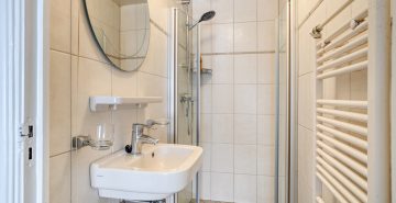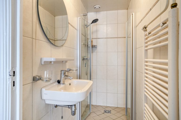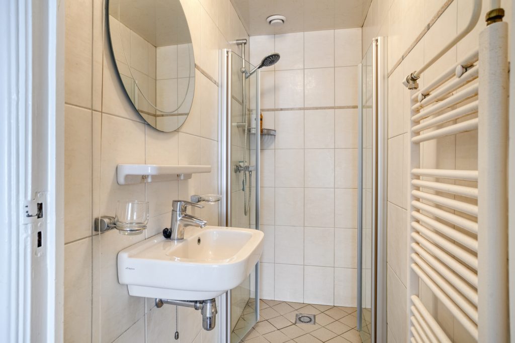 – Badkamer met douchecabine, wastafel en designradiator