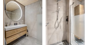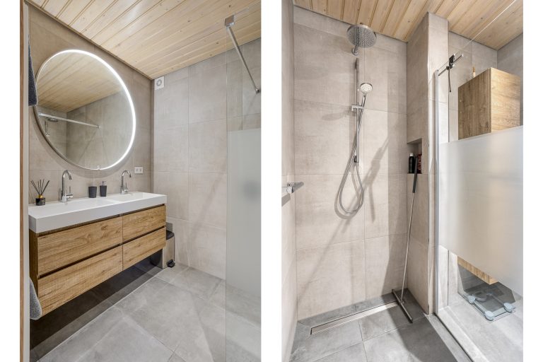 – Badkamer met inloopdouche, dubbele wastafel met badmeubel, designradiator en vloerverwarming