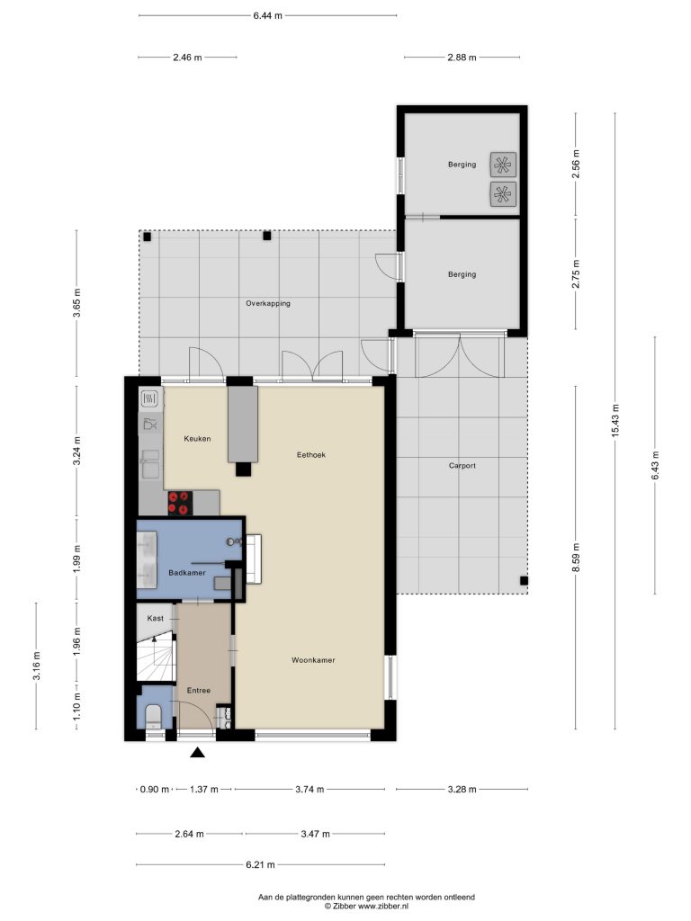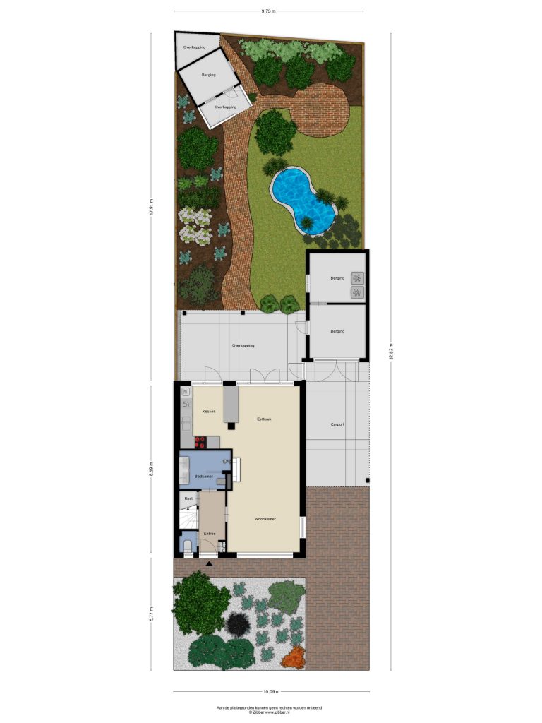 – Een stenen berging voorzien van elektra, vliering en garagedeuren