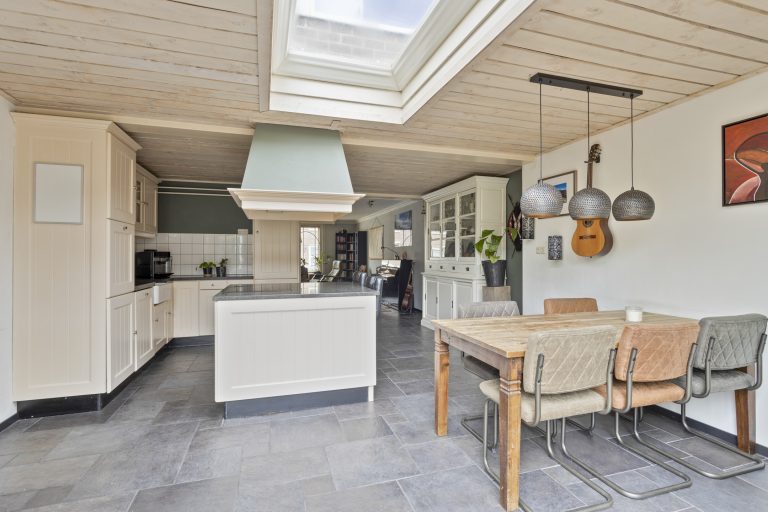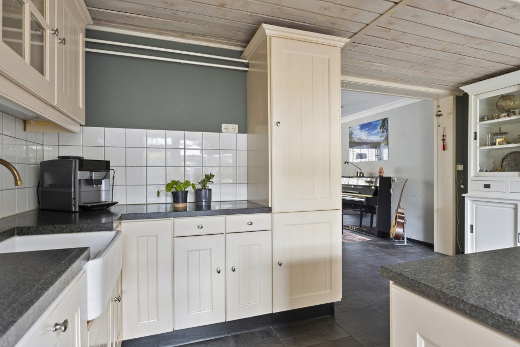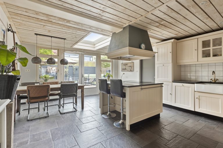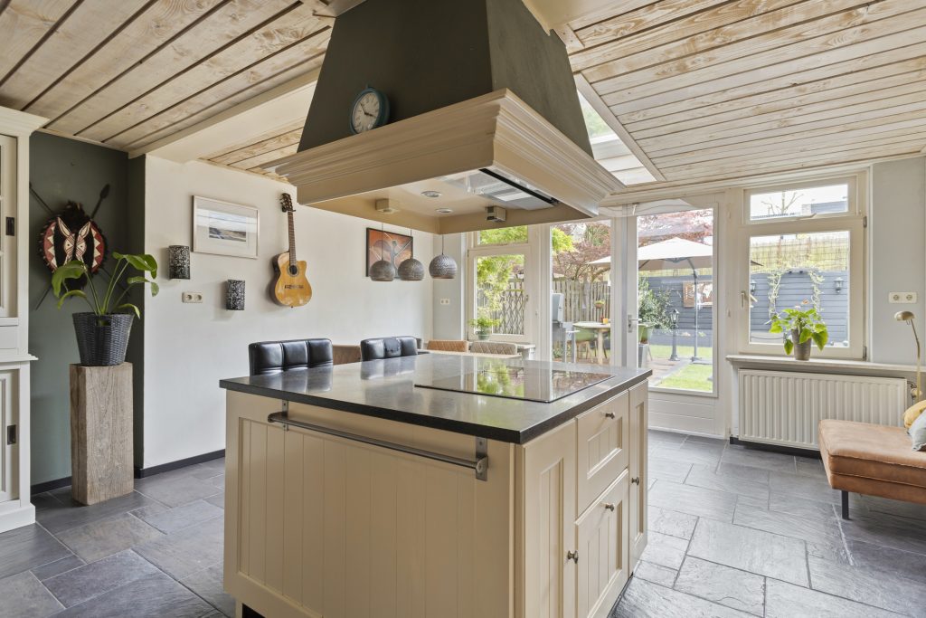 De halfopen keuken sluit perfect aan bij de gezellige stijl van de woning. Landelijk, licht en voorzien van een praktisch kookeiland met inductiekookplaat en afzuigkap. Verder is er natuurlijk gedacht aan alle gemakken: een vaatwasser (2022), koel-/vriescombinatie – alles zit erin.