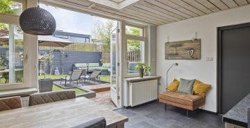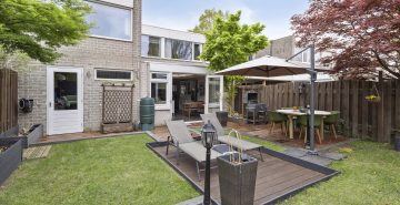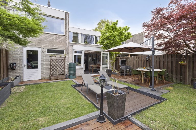 En dan buiten… De achtertuin ligt pal op het zuiden, dus zonliefhebbers kunnen hier hun hart ophalen. De tuin is helemaal omsloten en biedt daardoor volop privacy. Dankzij de verschillende terrassen, het gazon en de groene borders is het hier heerlijk toeven.
