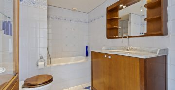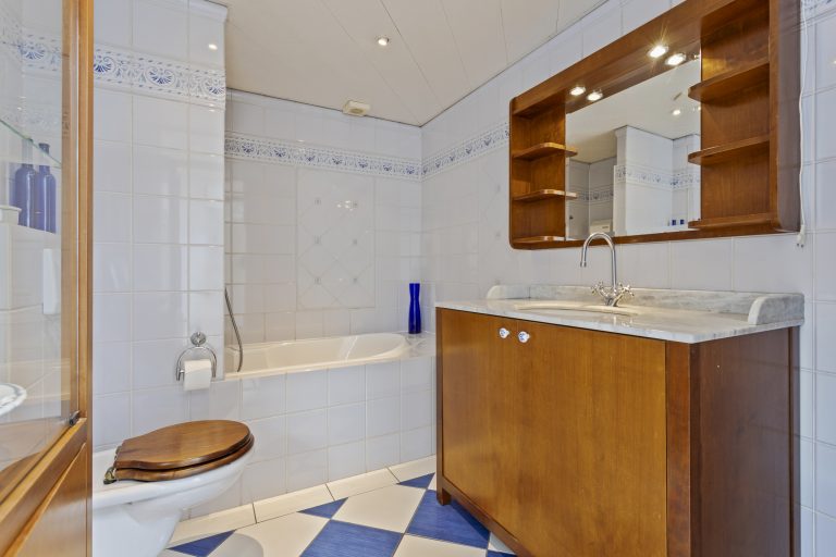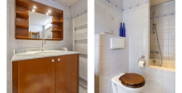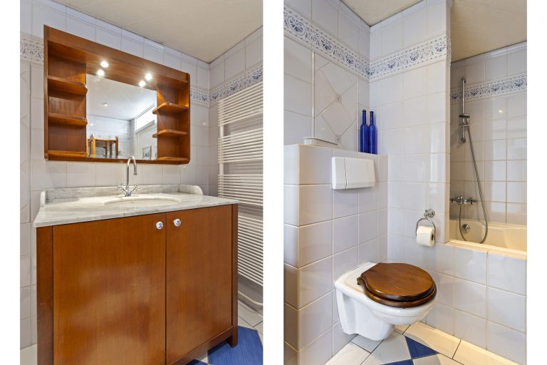 – De badkamer is ingedeeld met een ligbad, een toilet en een wastafel met badmeubel